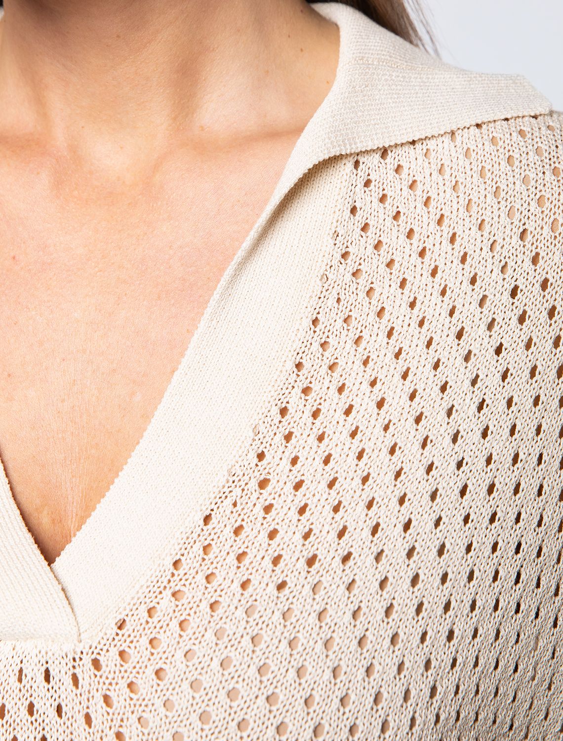 Джемпер-поло связан фактурным узором из тонкой пряжи на основе вискозы с лиоцеллом. Глубокий V- вырез подчеркивает линию шеи. Гладкое и достаточно прочное изделие хорошо держит форму, в нем будет комфортно даже в жаркое время года. Можно носить с бежевым бельем или хлопковым топом. Для самых смелых – на голое тело.