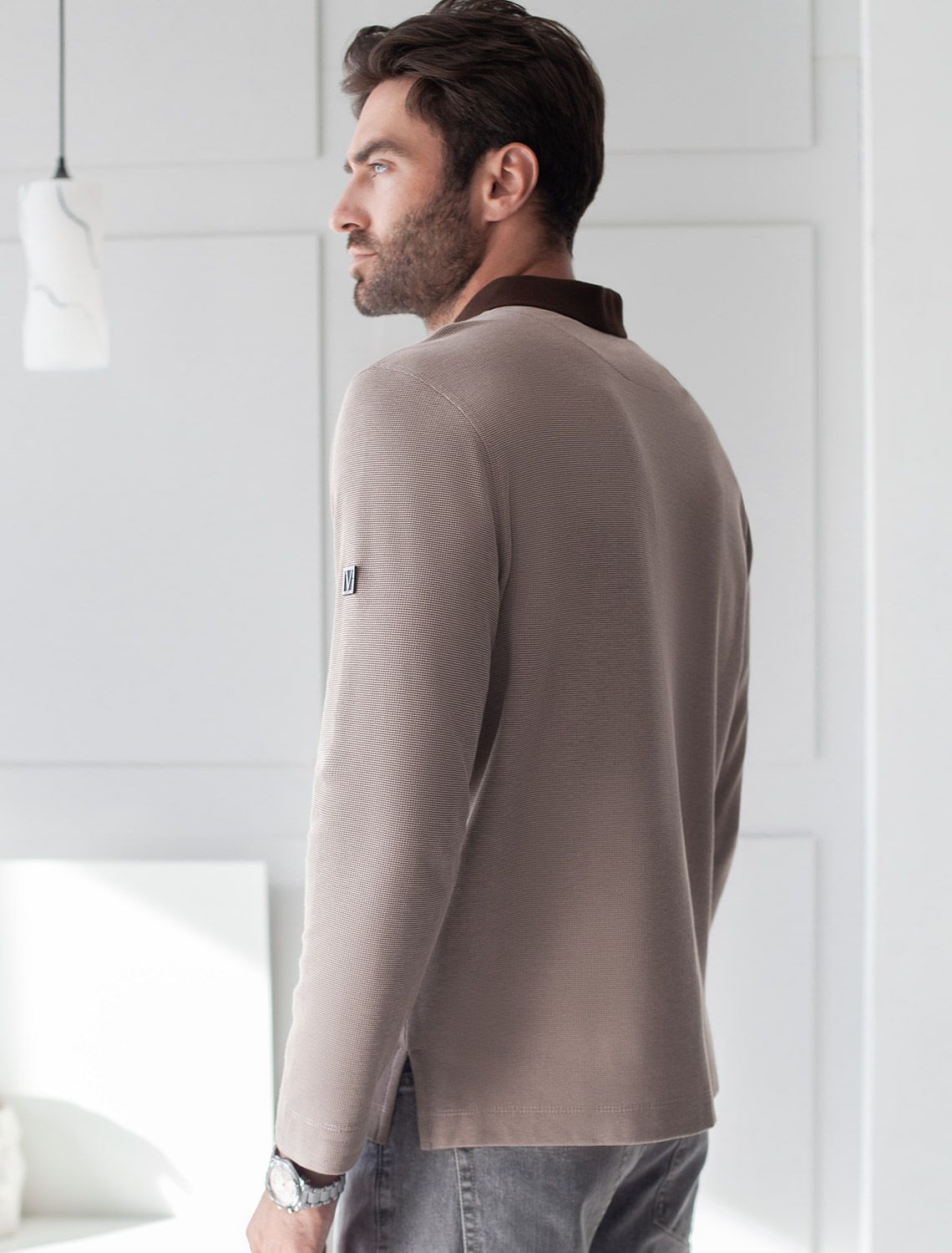 Стильный лонгслив коричневого цвета с плетеным воротником поло с застежкой на молнию выполнен из премиального хлопка в сочетании с эластаном .Невероятно мягкая ткань из натуральных волокон - она едва ощутима на коже и словно обнимает тело. Материал при касании кажется бархатистым, при движении он словно повторяет все мельчайшие линии фигуры. По свойствам материал сочетает в себе практичность и нежность: отлично провускает воздух, сохраняя ощущение свежести в течение всего дня, при этом созраняет тепло в прохладную погоду.Идеально подходит для чувствительной кожи, не вызывает раздражения и дискомфорта. Удобный отложной контрастный воротник делает образ современным и стильным, а длинные рукава с манжетами защищают руки при ветреной погоде.