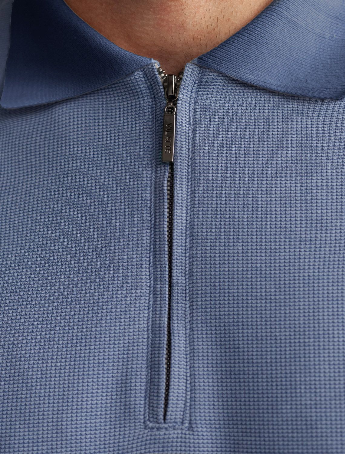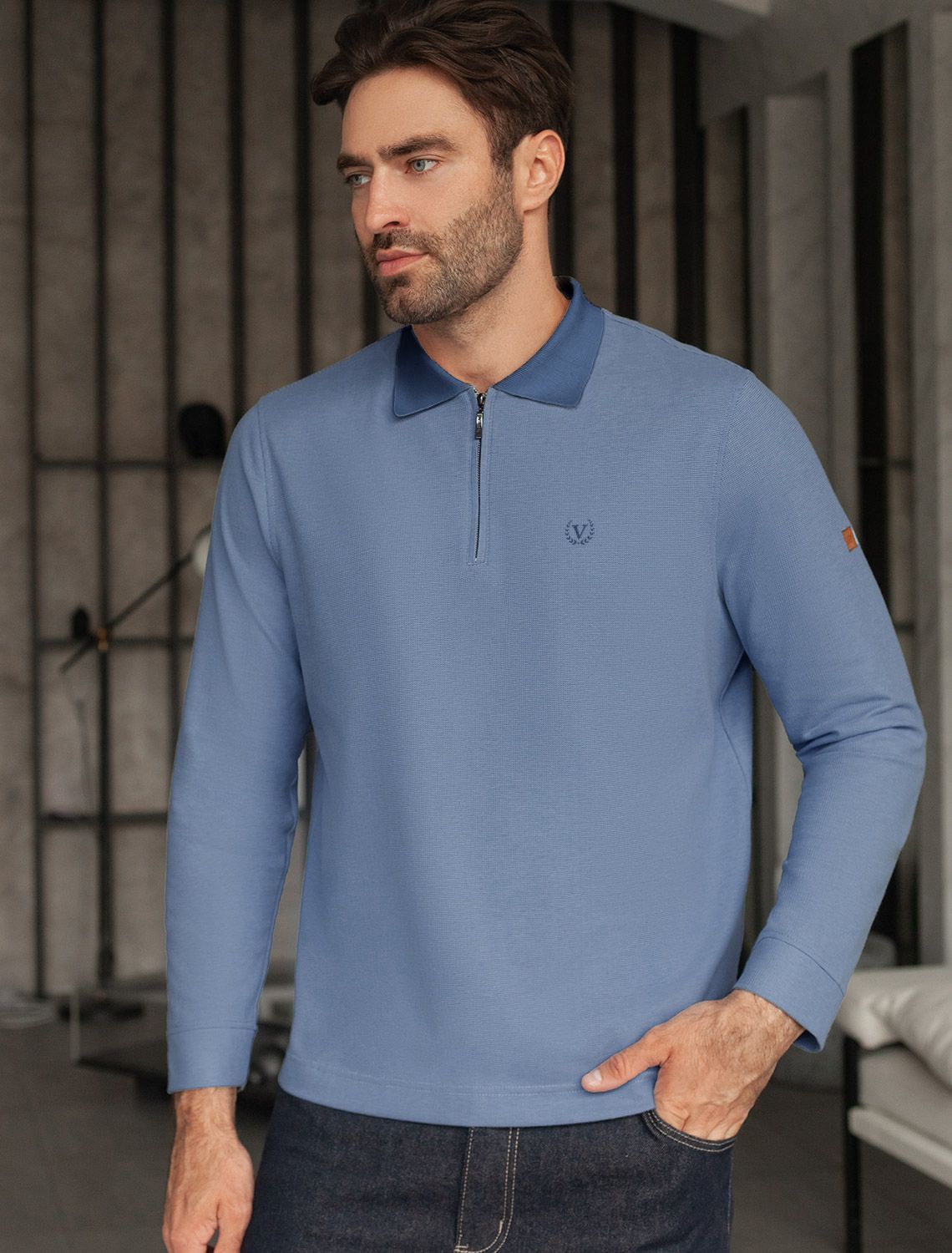 Стильный лонгслив светло-синего цвета с плетеным воротником поло с застежкой на молнию выполнен из премиального хлопка в сочетании с эластаном .Невероятно мягкая ткань из натуральных волокон - она едва ощутима на коже и словно обнимает тело. Материал при касании кажется бархатистым, при движении он словно повторяет все мельчайшие линии фигуры. По свойствам материал сочетает в себе практичность и нежность: отлично провускает воздух, сохраняя ощущение свежести в течение всего дня, при этом созраняет тепло в прохладную погоду.Идеально подходит для чувствительной кожи, не вызывает раздражения и дискомфорта. Удобный отложной воротник делает образ современным и стильным, а длинные рукава с манжетами защищают руки при ветреной погоде.
