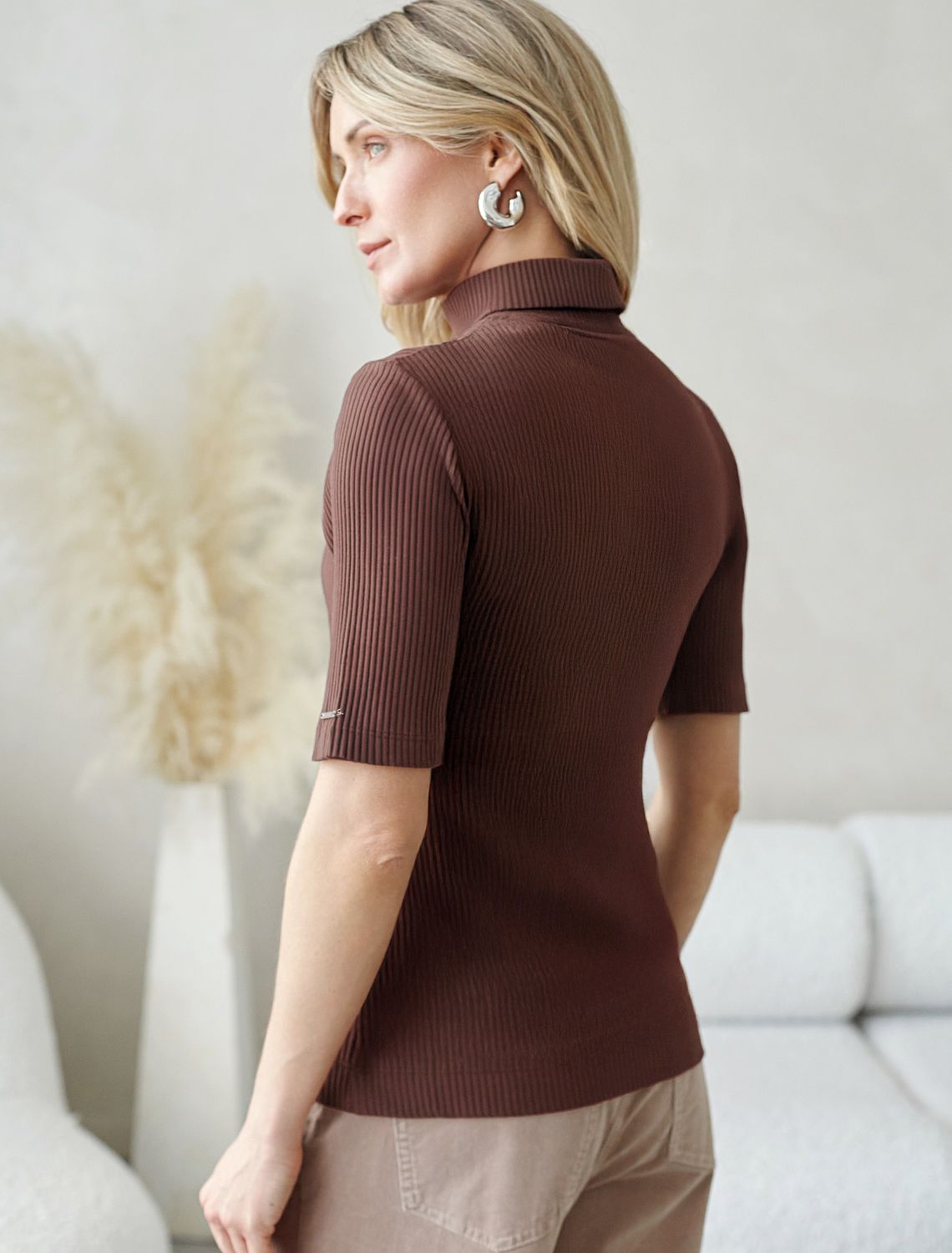 Водолазка с коротким рукавом выполнена из фактурного трикотажа в рубчик. Модель идеально сидит по фигуре не сковывая движения. Хлопковый трикотаж поддерживает оптимальную температуру тела, поэтому в изделии будет комфортно в течении всего дня. Наличие эластана в составе гарантирует формоустойчивости. Водолазка отлично впишется в деловой дресс-код и подойдет для повседневного аутфита.