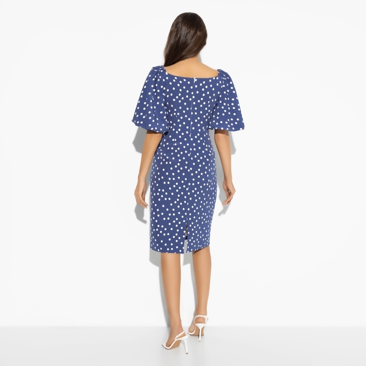 Он пригласил тебя на собственный корпоратив, где ты мгновенно затмила собой высшее руководство. Элегантность, помноженная на простоту, равно платье CHARUTTI. Всем хватило внимания, никто не остался в обиде. Но все запомнили именно вас. Платье в синем цвете в горох. Приталенный силуэт, застежка-молния по спинке, длина чуть ниже колена на средний рост. Небольшой разрез сзади по линии шва. Расклешенный объемный рукав.