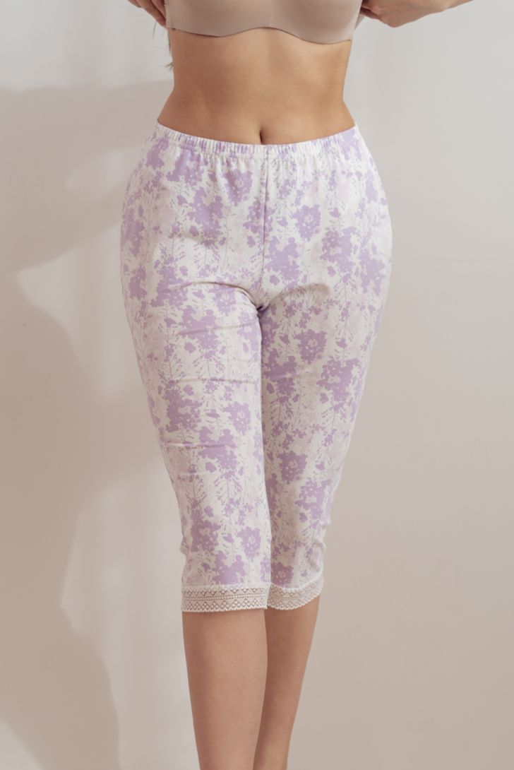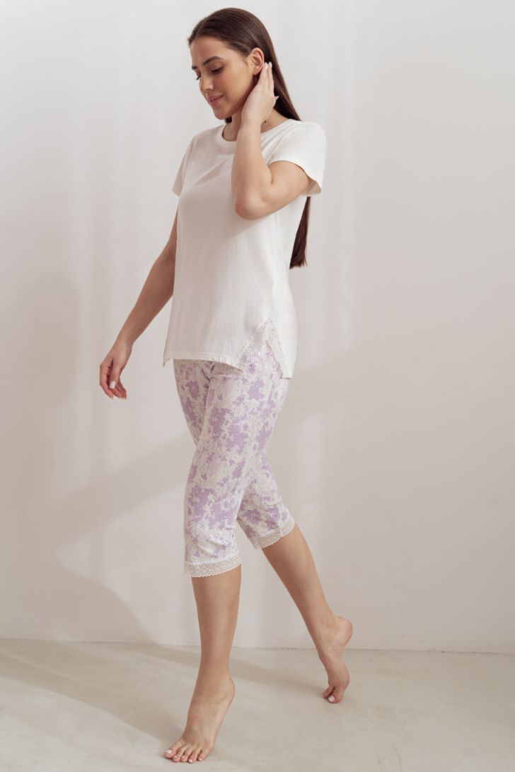 Нежная пижама, состоящая из джемпера с коротким рукавом и укороченных брюк на резинке. Низ брюк декорирован кружевными вставками.