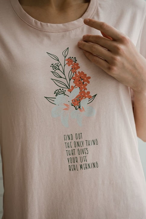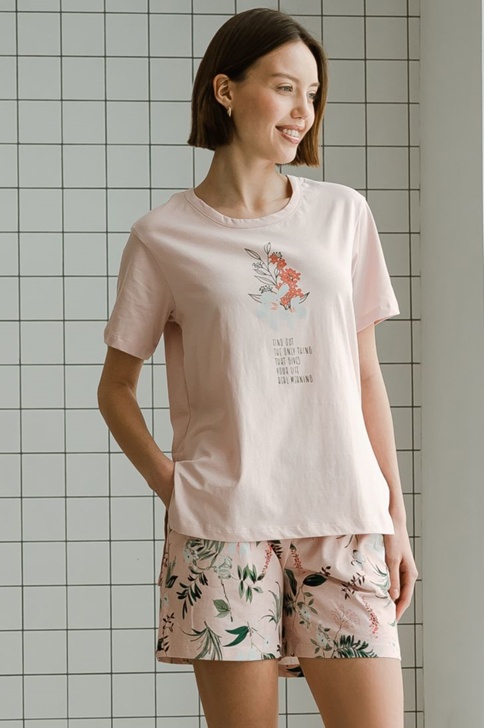 Комплект для дома состоит из футболки и шорт. Футболка свободного прилегания с коротким рукавом и круглым вырезом горловины. Футболка декорирована тематическим принтом. Низ футболки ассиметричен. В боковых швах разрезы. Шорты классической длины с карманами в боковых швах.
