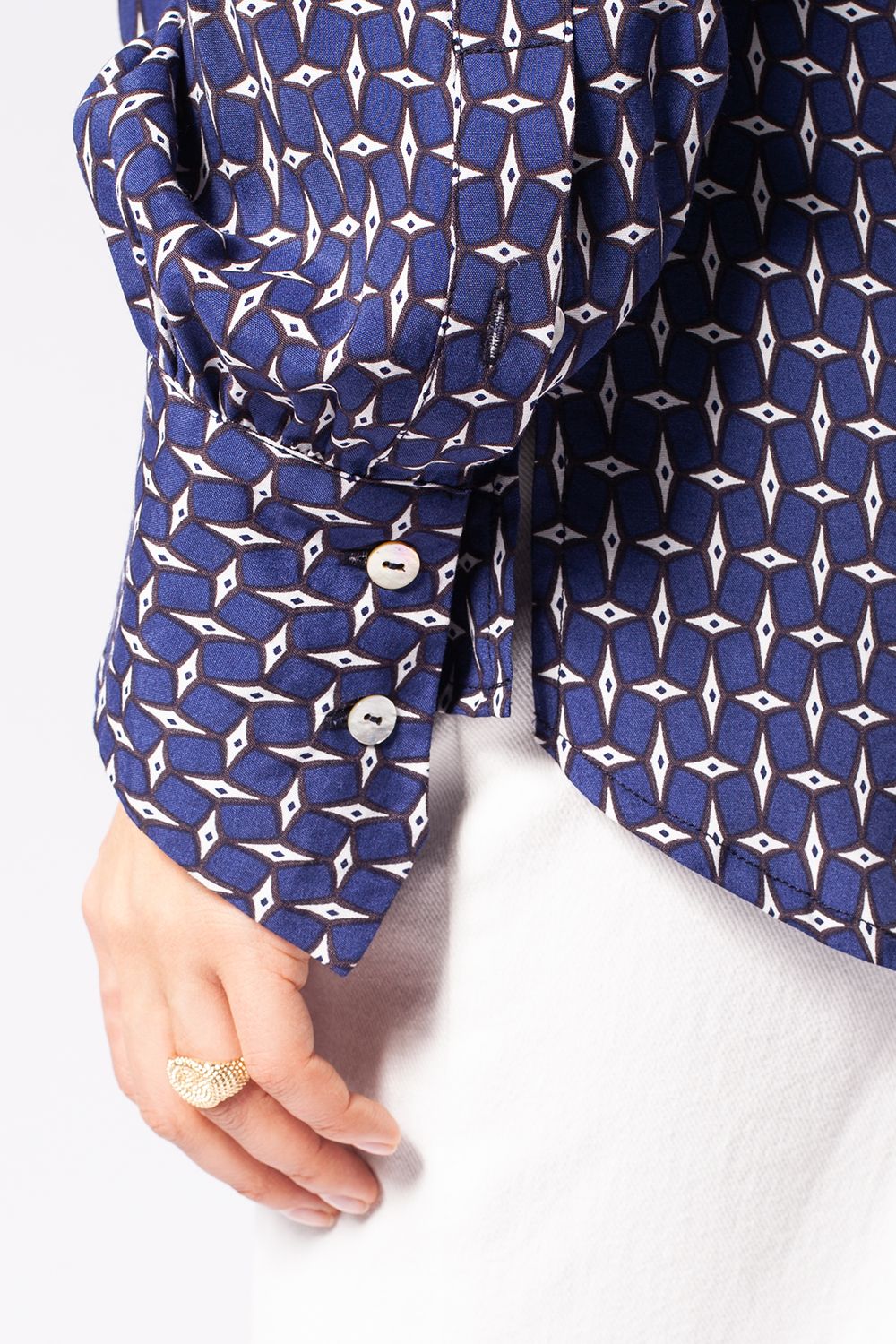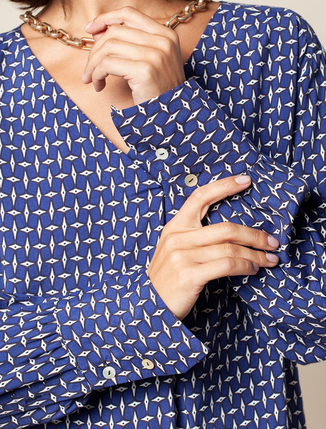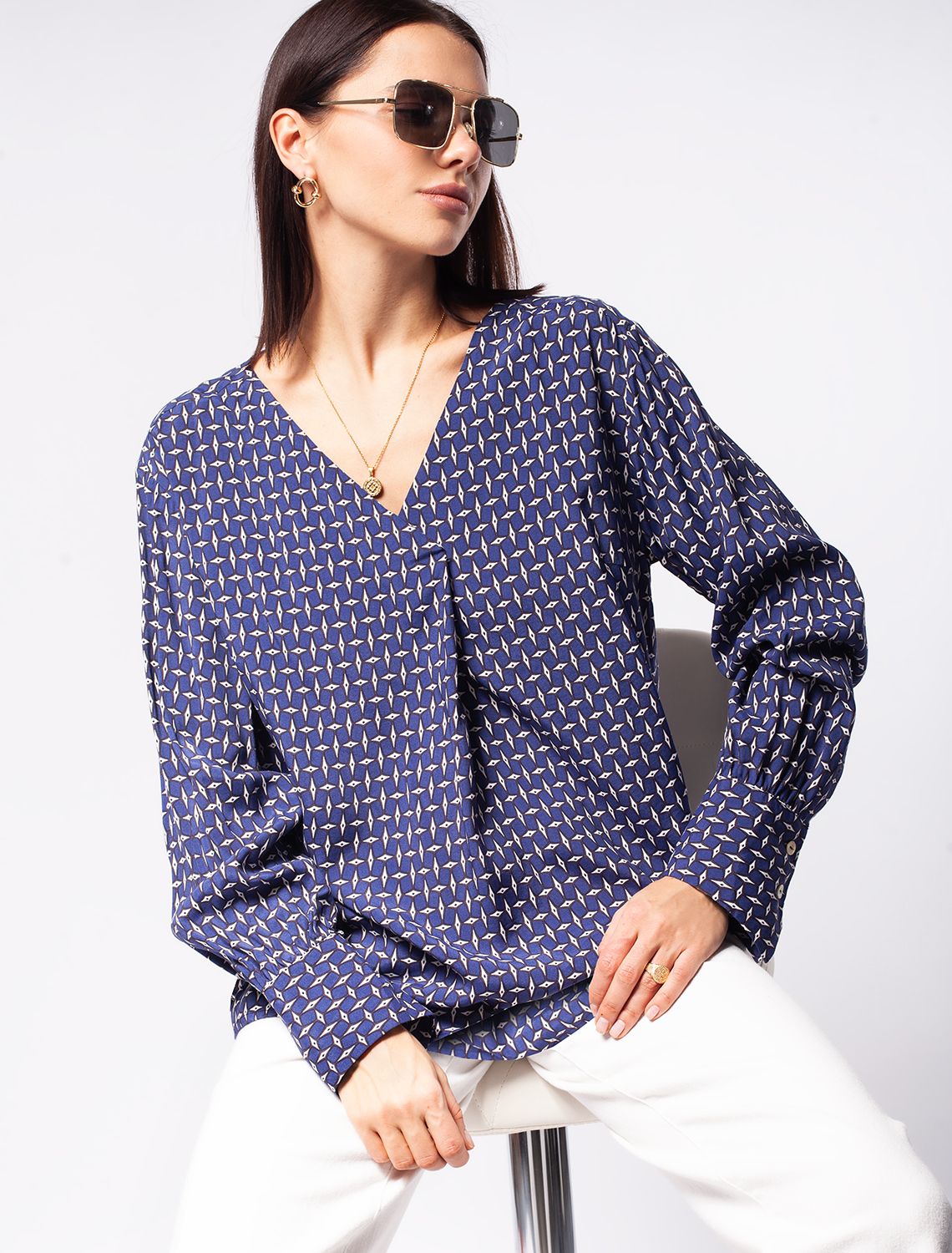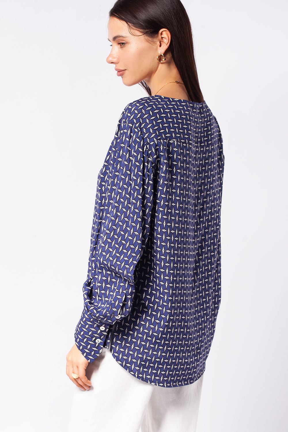 Блузка свободного кроя без застежки из лиоцелла с вискозой. Выполнена из премиальной вискозы с матовым блеском, как у натурального шелка. Крупный геометрический принт поддержан дизайнерскими манжетами. Изделие из легкого материала сохраняет безупречный вид в течение всего дня.