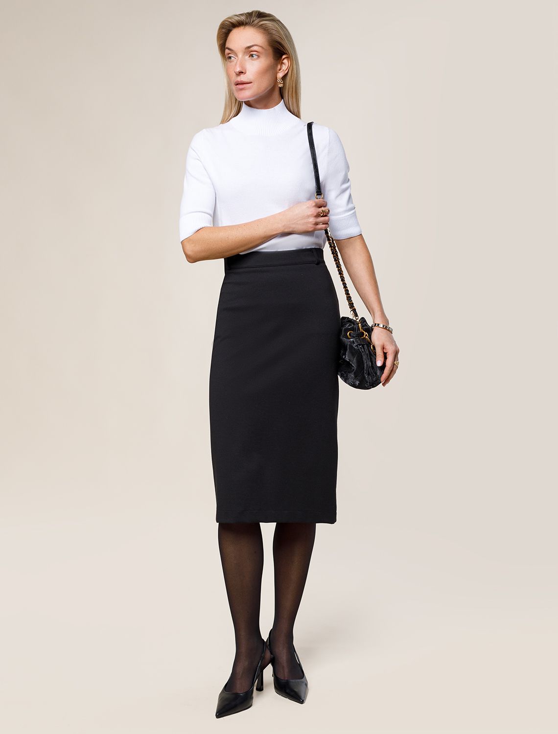 Юбка-карандаш выполнена из плотного джерси. Высокая посадка на талии. Сзади застежка на потайную молнию и шлица. Эластичный джерси почти не мнется, хорошо сохраняет форму и не оставляет заломов. Классический вариант для офиса или делового мероприятия.