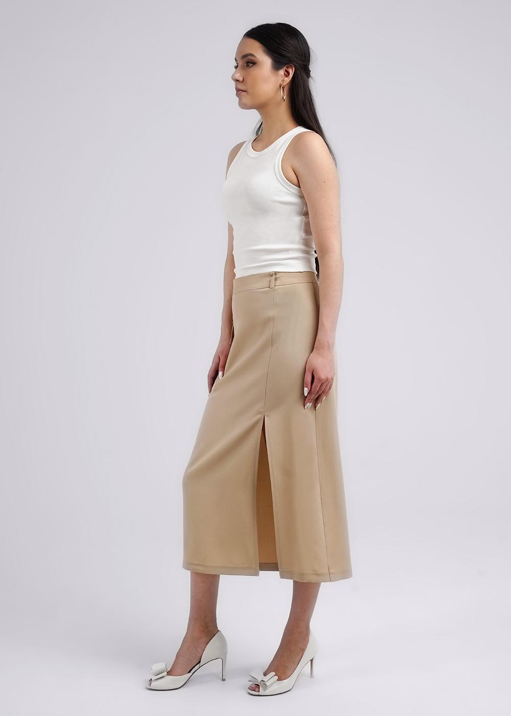 Юбка миди из текстильного полотна штапель. По талии притачной пояс со шлевками. По переду боковой разрез, справа накладной карман с клапаном. По спинке средний шов с застежкой на молнию, вытачки.