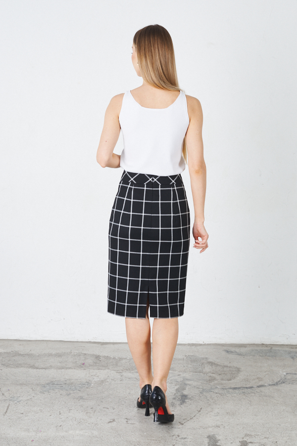 Юбка прилегающего силуэта из костюмной ткани. Сзади по среднему шву застёжка-молния, снизу разрез. Пояс притачной. Изделие на подкладке.