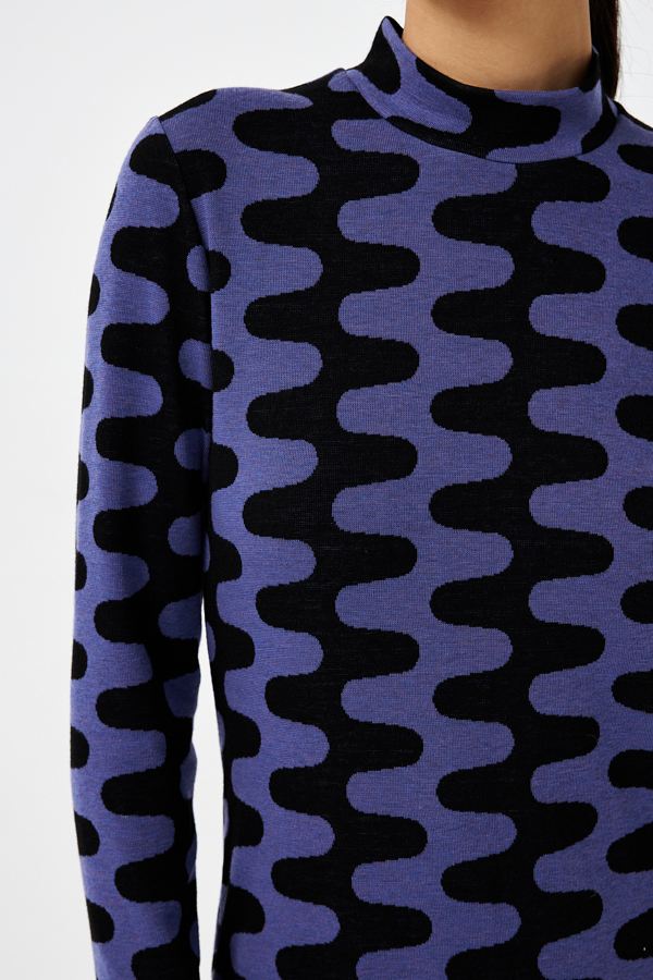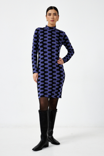 Платье полуприлегающего силуэта из эластичного полотна с жаккардовым узором. Вырез горловины оформлен воротником-стойкой. Втачной длинный рукав.