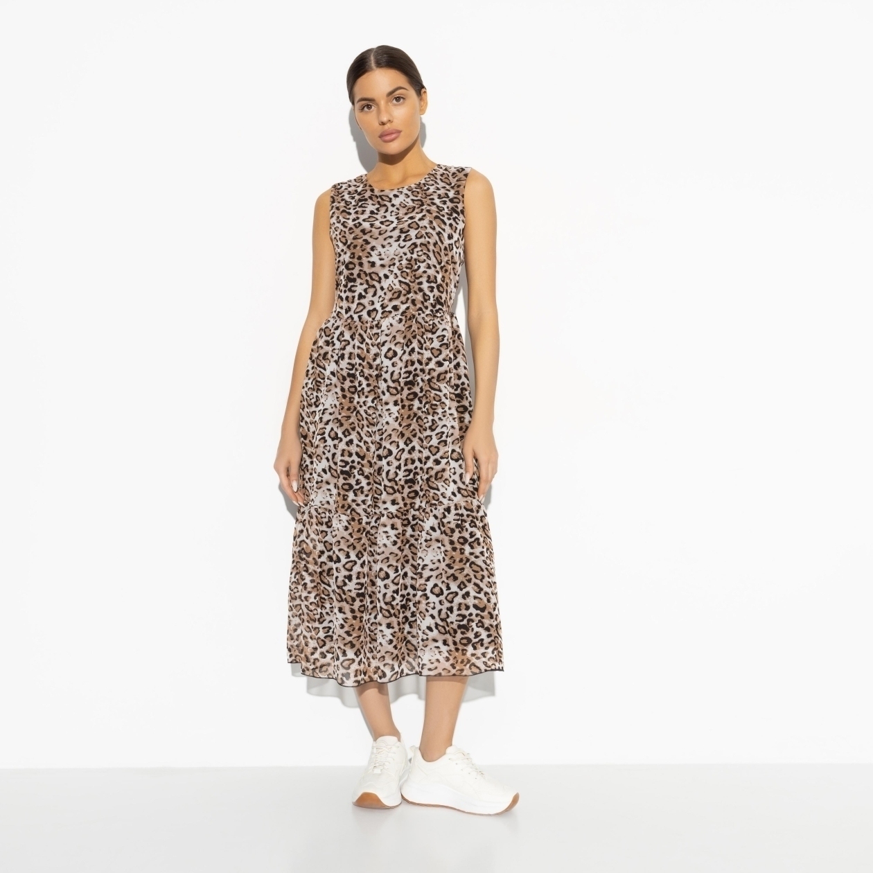 Быть заметной на вечеринке важно. Бармен должен обслуживать вас в первую очередь, диджей ставить песни по вашему заказу, и такси должно остановиться возле вас, как только вы пожелаете. Для такого сценария подходит леопардовое платье. Платье в длине миди без рукавов. Юбка летящего кроя. Ткань – имитация шифона.