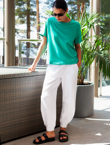 Шорты выполнены из плотного лиоцела. Добавление синтетических волокон в составе изделия предотвращает сминаемость. Эластичный пояс на резинке фиксирует изделие не сковывая движений. Есть дополнительные шлевки для ремня. Свободная модель дополнена боковыми карманами и металлическим логотипом бренда. Для создания завершенного образа сочетайте в костюме с топом D23.058, блузкой D28.054, D29.238, D29.239 и D29.240