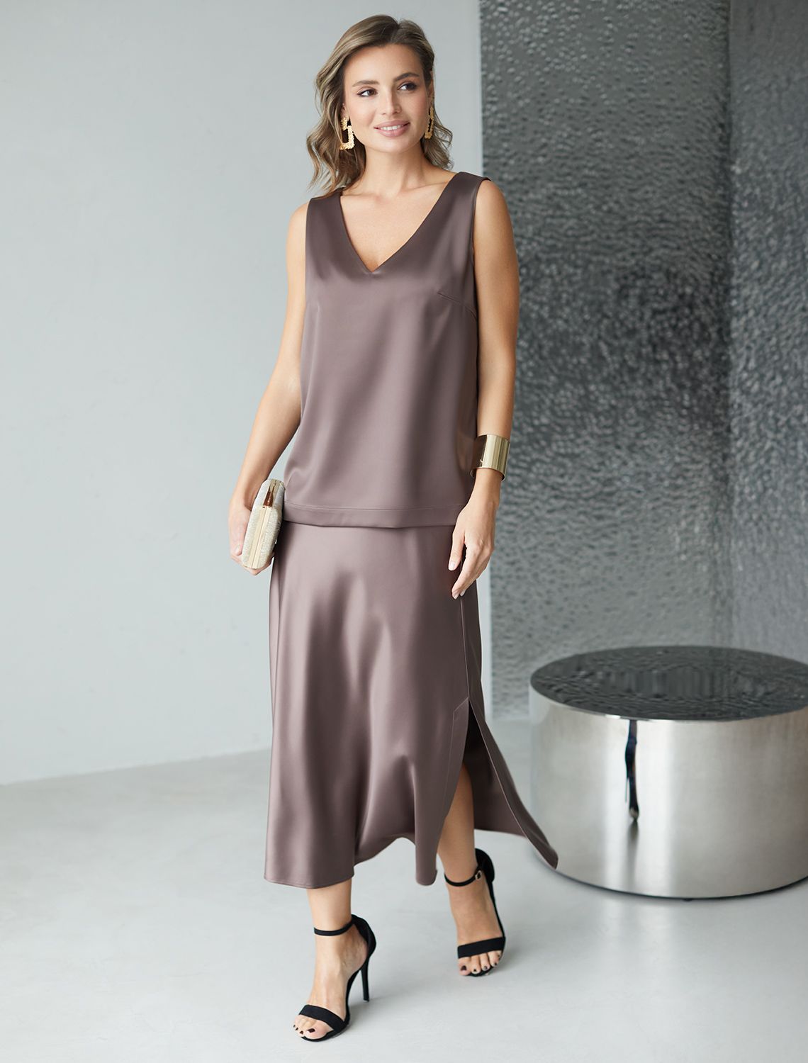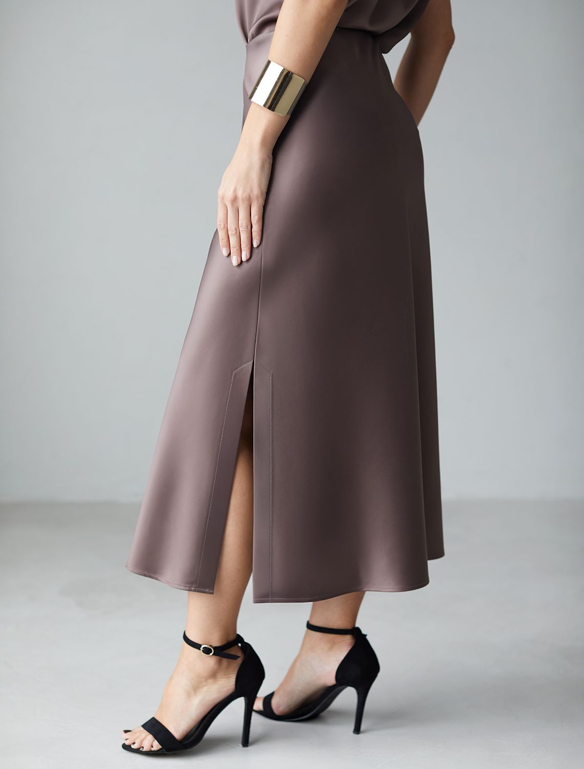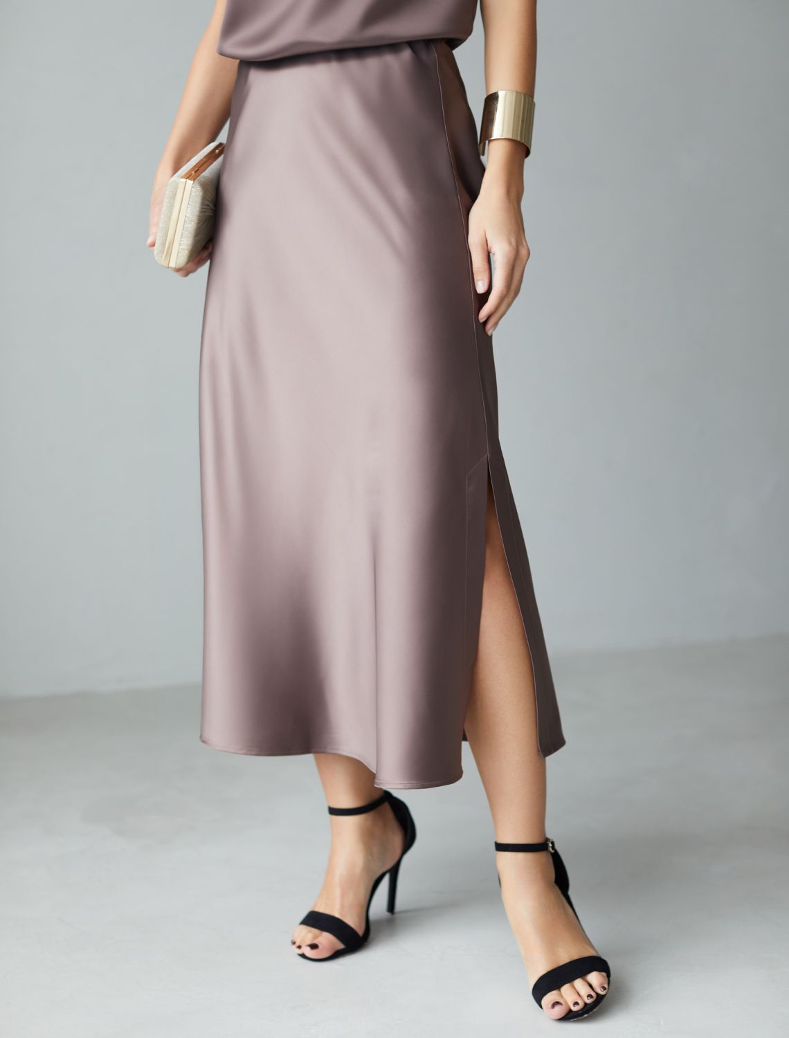Юбка миди кофейного цвета с разрезом из струящегося плотного сатина — находка для модниц, ценящих элегантную классику и современный стиль. Модный крой длинной юбки подчеркивает фигуру, а мягкий эластичный пояс обеспечивает дополнительный комфорт на протяжении всего дня. Благодаря продуманному крою, юбка хорошо сидит на фигуре и подчеркивает силуэт без лишних деталей, подойдет для обладательниц пышных форм и девушек маленьких размеров. Шелковистая текстура материала приятно ощущается на коже, не просвечивает и сохраняет форму даже после длительной носки. Гладкая поверхность добавляет благородного блеска, делая образ неповторимым и шикарным в любой ситуации. Струящийся плотный сатин отличается устойчивостью к сминанию: юбка не мнется, что позволяет выглядеть безупречно на работе, встрече или прогулке. Атласная юбка придает образу элегантный и благородный вид, а разрез добавляет легкую динамичность и создает утонченный акцент на линии ног, сохраняя при этом сдержанную женственность. Юбка визуально вытягивает силуэт, делая походку грациозной и легкой.