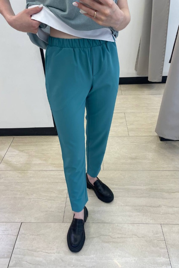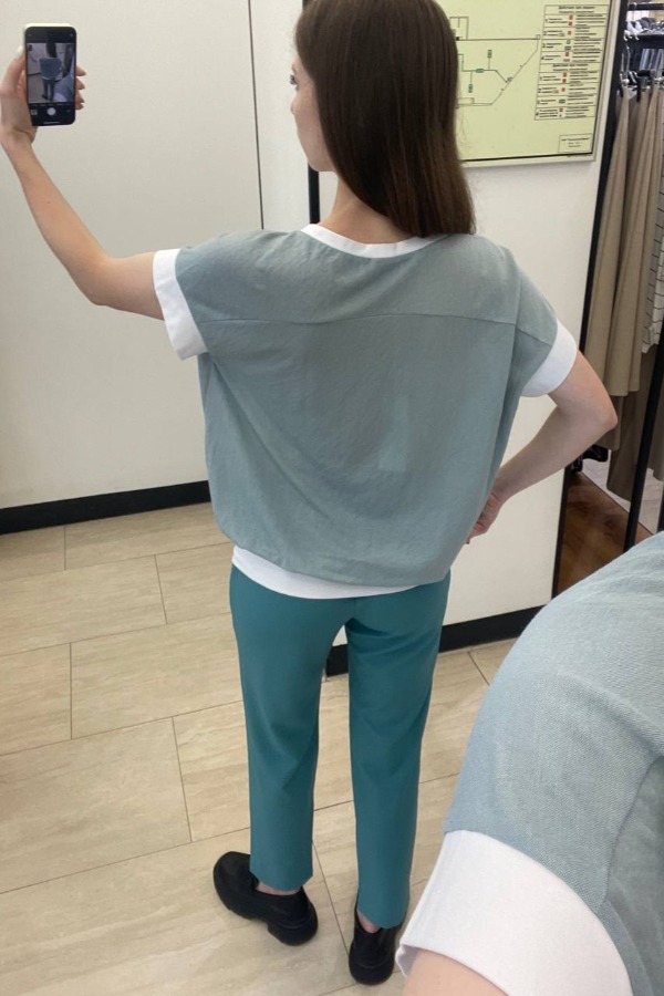 Комбинированный костюм из брюк и свитшота в цветовой гамме «морская волна». Брюки из брючной ткани с легким стрейч эффектом, зауженные книзу. Длина до щиколотки, в боковых швах карманы. Пояс притачной с эластичной резиной. На передней части брюк имитация гульфика. Свитшот из эластичного полотна свободного кроя асимметричной длины (спинка удлинена относительно переда) со спущенным плечом на манжете. На передней и задней части изделия кокетка. Круглый вырез горловины обработан бейкой. Низ подхвачен притачным поясом с небольшими разрезами по бокам.