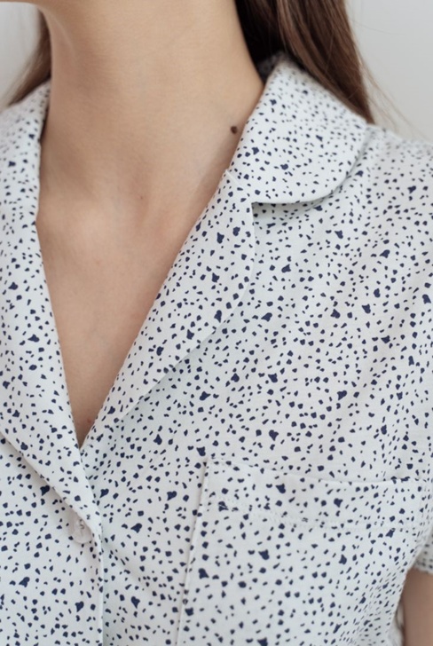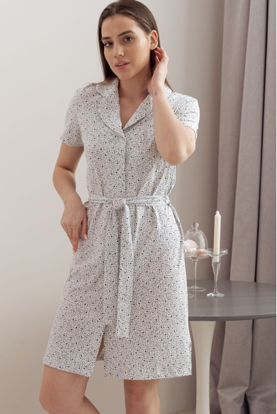 Халат-платье на пуговицах прямого свободного силуэта на поясе. Рукав короткий. Английский воротник с закругленными краями придает женственность образу. Халат декорирован накладным карманом на груди. Два цветовых решения.