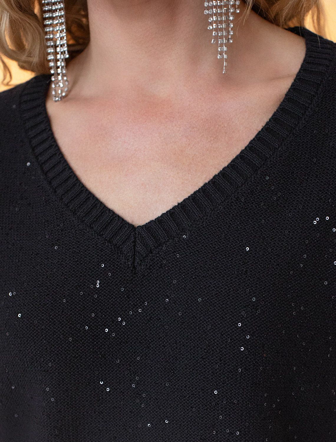 Легкий джемпер черного цвета с V вырезом и коротким рукавом выполнен из хлопковой пряжи с вкраплением сияющих пайеток, что придает особую изысканность. Нарядный джемпер связан изнанкой, пряжа отличается легкостью и приятной текстурой, совершенно не колется, обеспечивает комфорт даже при длительном использовании, а натуральные волокна поддерживают оптимальный температурный баланс. Свободный крой с эластичной манжетой по низу и цельнокроенный рукав создают расслабленый, но аккуратный образ. Умеренно открытое декольте вытягивает шею и подчеркивает ее изящество. Стильный джемпер подойдет девушкам и женщинам больших размеров, в нем вы будете чувствовать себя уверенно и свободно в любой ситуации. Блестящий эффект пайеток добавляет образу выразительности и индивидуальности. Мерцающее полотно добавляет особого шарма вашему образу, делая его уместным как на праздник, так и для повседневного выхода. Новый год, вечеринка или любое другое мероприятие пройдут ярко — сияющие пайетки создают ощущение праздника в каждом движении. Для спокойного повседневного аутфита добавьте к этому эффектному джемперу спокойный низ, близкий по цвету, без дополнительных элементов декора.