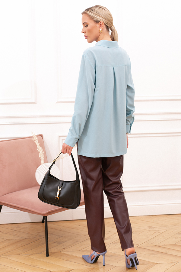Брюки из вискозного, эластичного полотна с покрытием, имитирующим кожу, зауженные книзу. На передней части брюк карманы с подкройным бочком. Притачной пояс, застёжка на металлическую молнию-гульфик и пуговицу.