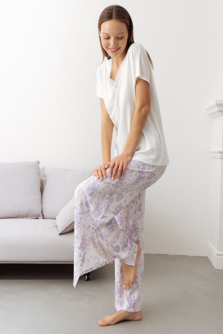 Нежная пижама, состоящая из джемпера с коротким спущенным рукавом и брюк на резинке. Разрезы по низу брюк подчеркнут элегантность и визуально увеличат длину ног ее прекрасной обладательницы.