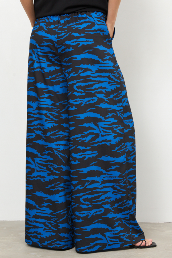 Брюки прямого свободного силуэта из вискозной ткани. Пояс притачной с эластичной резиной, в боковых швах карманы.