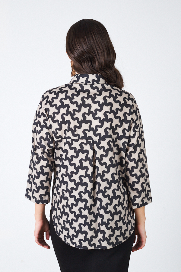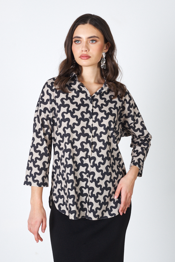 Блуза-рубашка свободного силуэта с застёжкой на пуговицы из вискозной ткани. Низ изделия с закруглениями по бокам. Втачной рукав в спущенную пройму. Вырез горловины обработан отложным воротником на стойке. На задней части изделия выполнена кокетка с небольшой складкой. Достоинство этой модели - в способности скрыть некоторые недостатки фигуры.