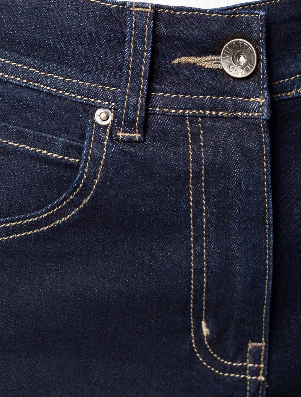 Прямые джинсы выполнены из эластичного денима. Удлиненная модель классического темно-синего цвета с контрастными строчками впишется в любой гардероб. Комфортная посадка на талии подходит для любой фигуры, ткань хорошо тянется и не сковывает движений. На поясе сзади расположен нашивка из эко-кожи с логотипом бренда. Длина изделия позволяет выбрать к образу обувь на каблуке