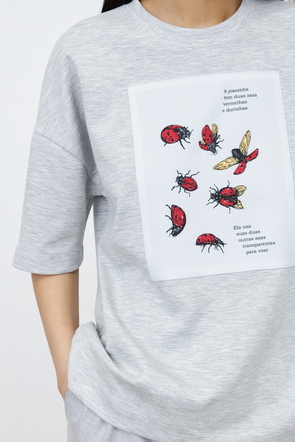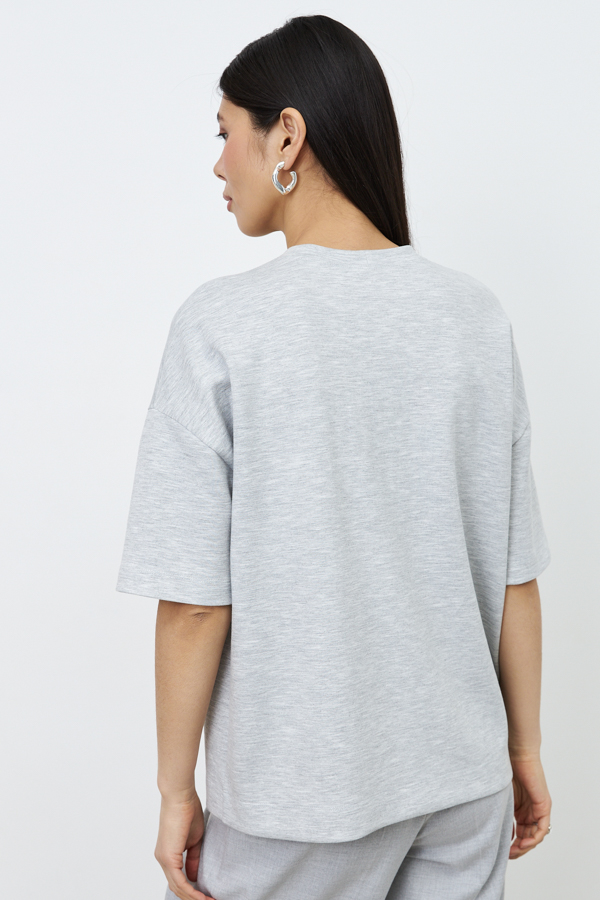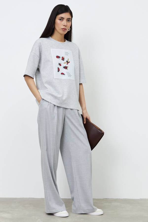 Джемпер свободного силуэта со спущенной линией плеча и рукавом до локтя выполнен из эластичного полотна. Вырез горловины оформлен бейкой из основной ткани. На передней части изделия выполнена аппликация. В таблице размеров представлены параметры человека, а не изделия.