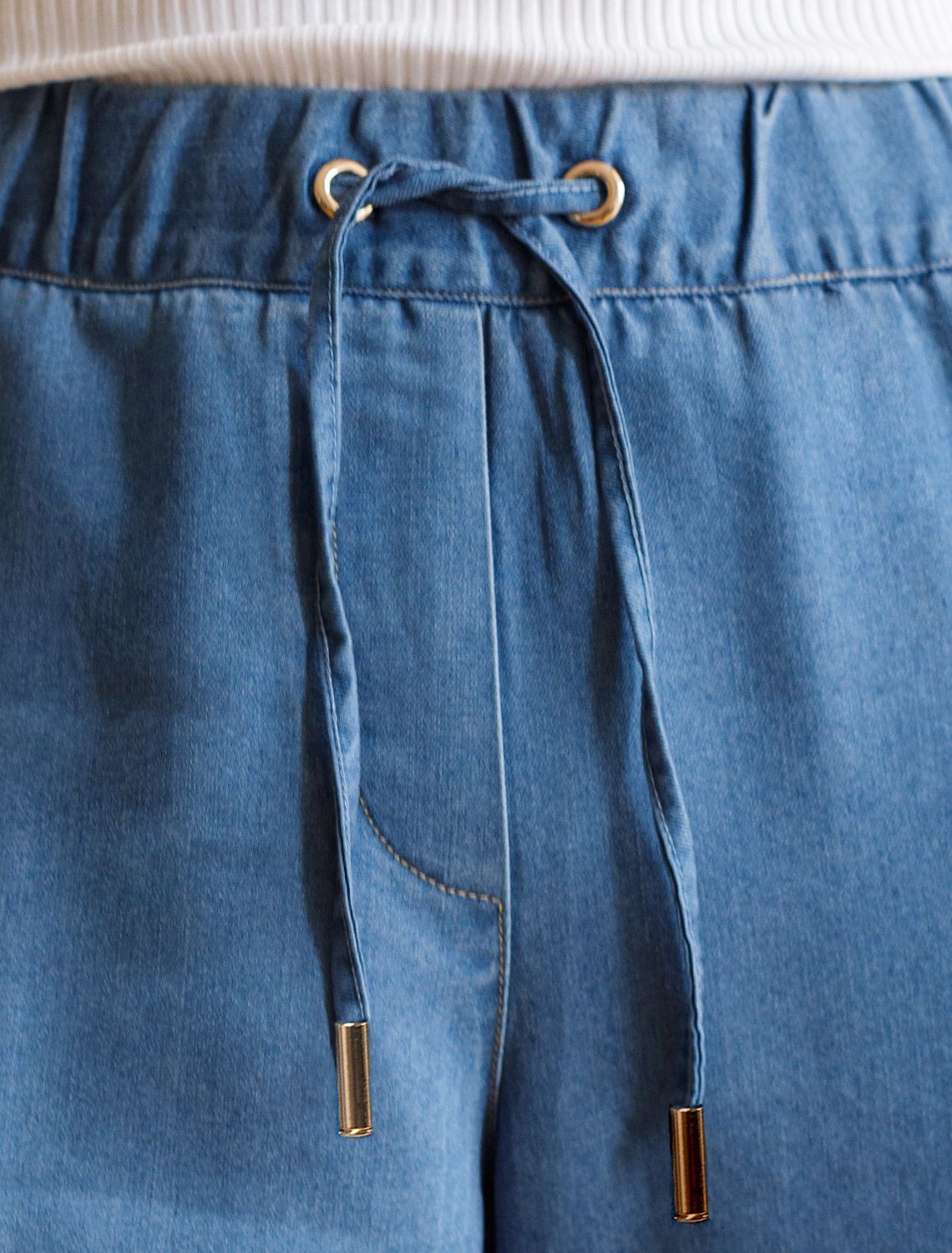 Брюки-дудочки выполнены из лиоцелла. Модель с эластичным поясом на резинке дополнена регулируемым шнуром из основного полотна, боковыми карманами и одним карманом сзади. Ткань с характерным атласным блеском полностью имитирует обычный деним, но в тоже время намного более мягкая, плавно струится по телу, хорошо драпируется и охлаждает кожу в жаркое время года. Изделие сочетается в костюме с блузкой D59.017