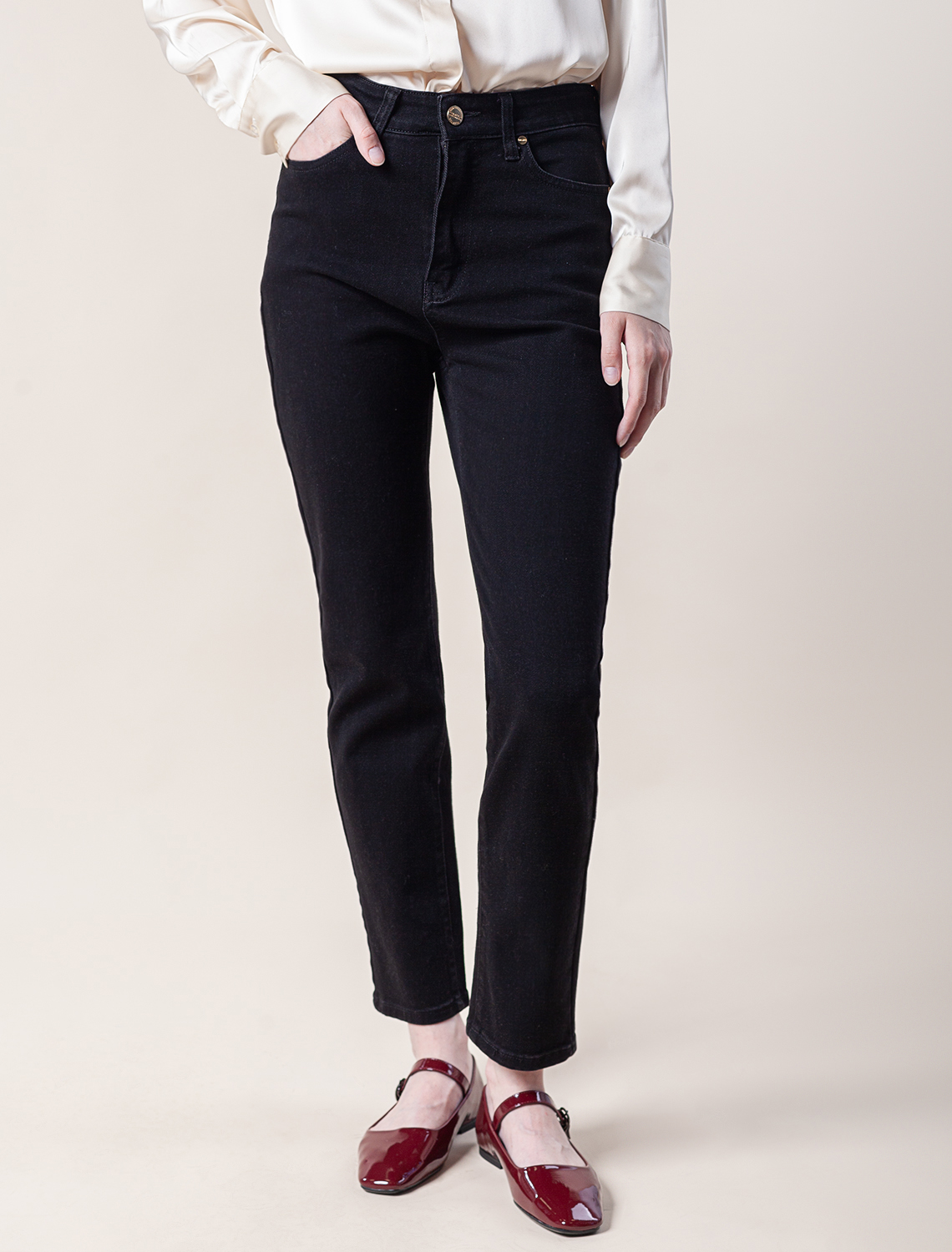 Джинсы прямого силуэта сшиты из эластичного денима средней плотности. Универсальные и практичные для любого времени года с кроссовкамии, туфлями и сапогами. На верх с классической блузкой, водолазкой и свитером крупной вязки.