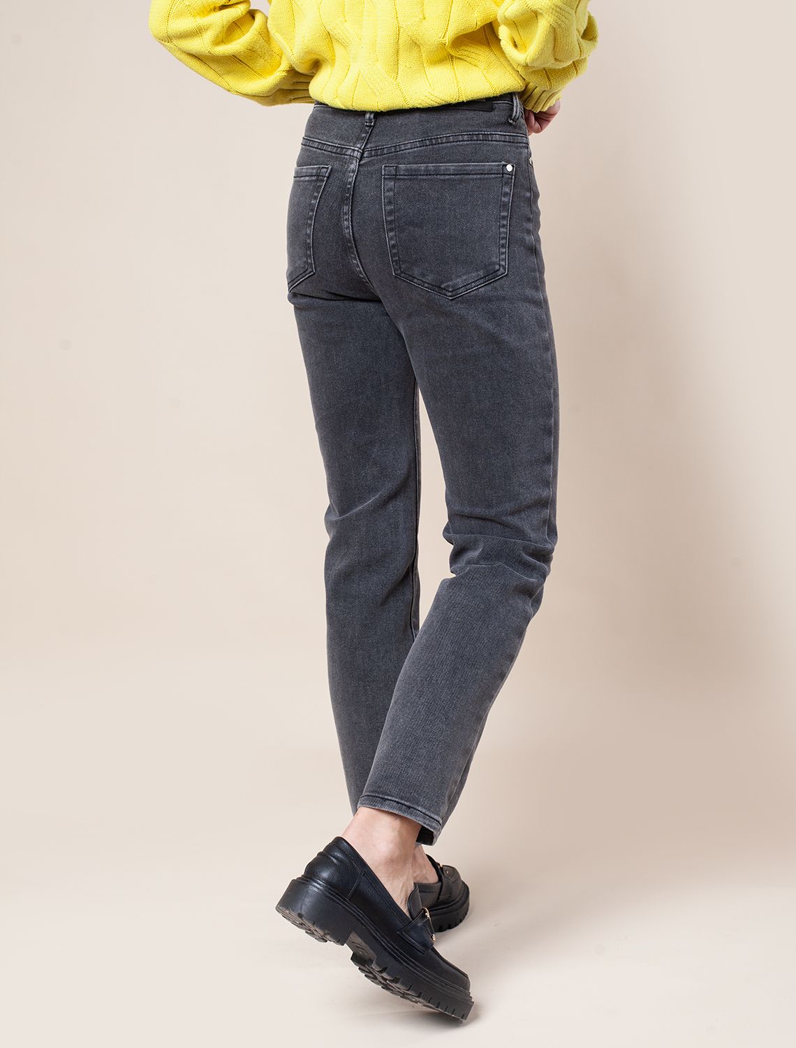 Джинсы прямого силуэта сшиты из эластичного денима средней плотности. Универсальные и практичные для любого времени года с кроссовкамии, туфлями и сапогами. На верх с классической блузкой, водолазкой и свитером крупной вязки.