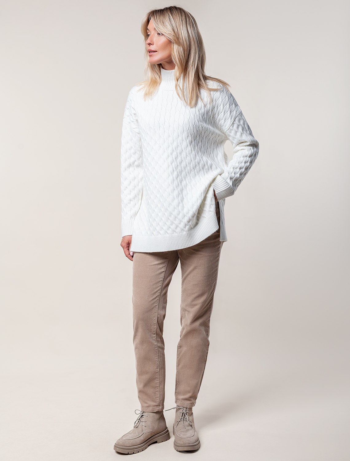 Свитер фактурной вязки косы выполнен из мягкой пряжи с кашемиром. Удлиненная свободная модель впишется в любой гардероб и поможет создать стильные расслабленные образы для любой фигуры. Нежная пряжа приятно ощущается на теле. Отдельным украшением служит металлический логотип бренда.