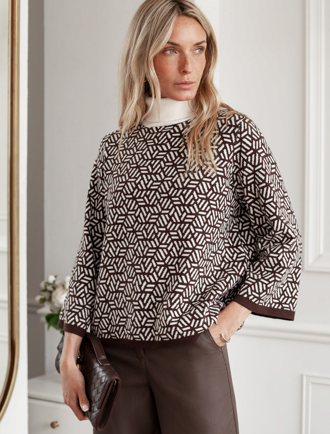Свитер жаккардовой вязки выполнен из нежной пряжи на основе вискозы с добавлением кашемира. Модель свободного силуэта с укороченным рукавом подходит для любой фигуры. Жаккардовый узор выглядит дорого и роскошно, делая любой образ респектабельным. Нежная пряжа комфортно ощущается на теле, сохраняя оптимальное тепло при этом не перегревая