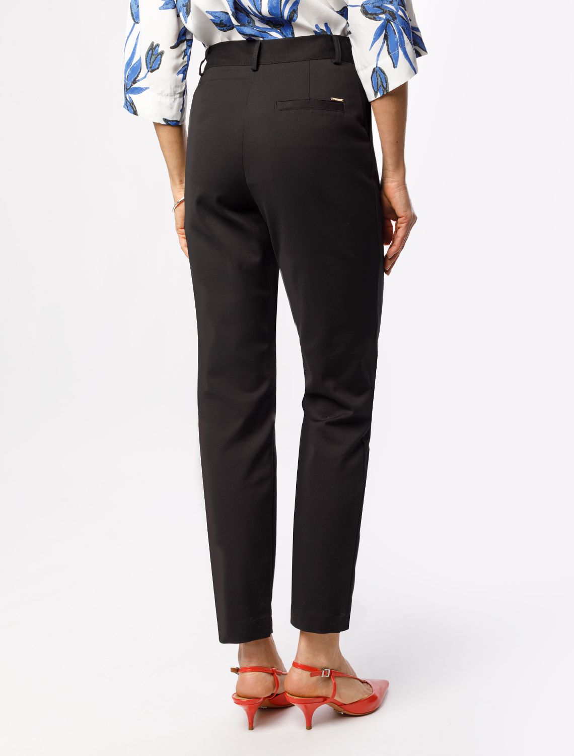 Брюки выполнены из плотной эластичной хлопковой ткани с нейлоном. Зауженная модель визуально вытягивает силуэт и стройнит ноги. Плотная и при этом эластичная ткань отлично держит форму в течении всего дня гарантируя абсолютный комфорт, не сковывая движений.