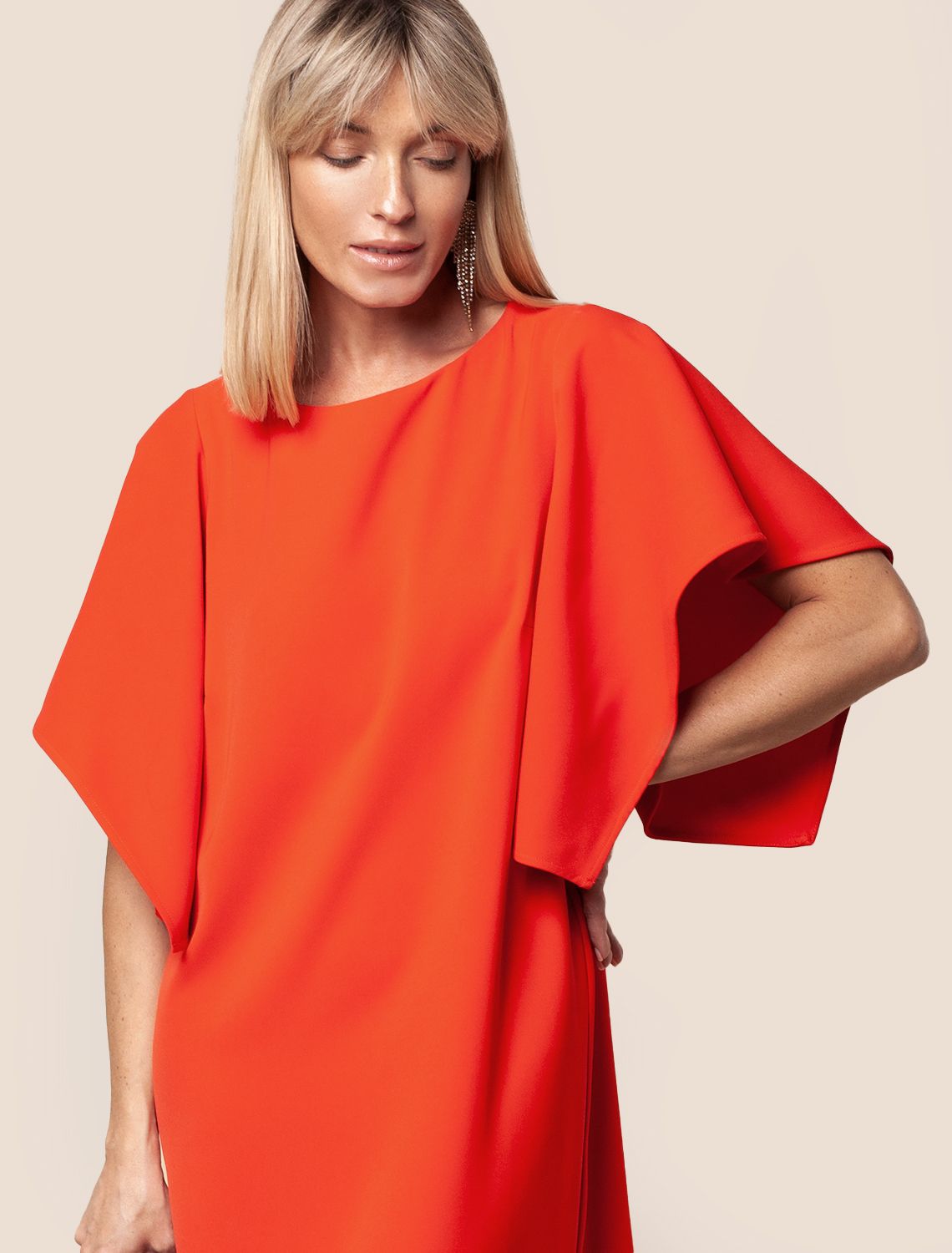 Платье из плотного струящегося крепа прямого кроя с «парящими» рукавами. Фасон платья сбалансирует любой тип фигуры: прямой свободный крой, универсальная длина подола – чуть ниже колена, широкая пройма и акцентные рукава. Классический О-образный вырез фиксируется сзади изящной золотой пуговицей. Материал почти не мнется и комфортен в носке.