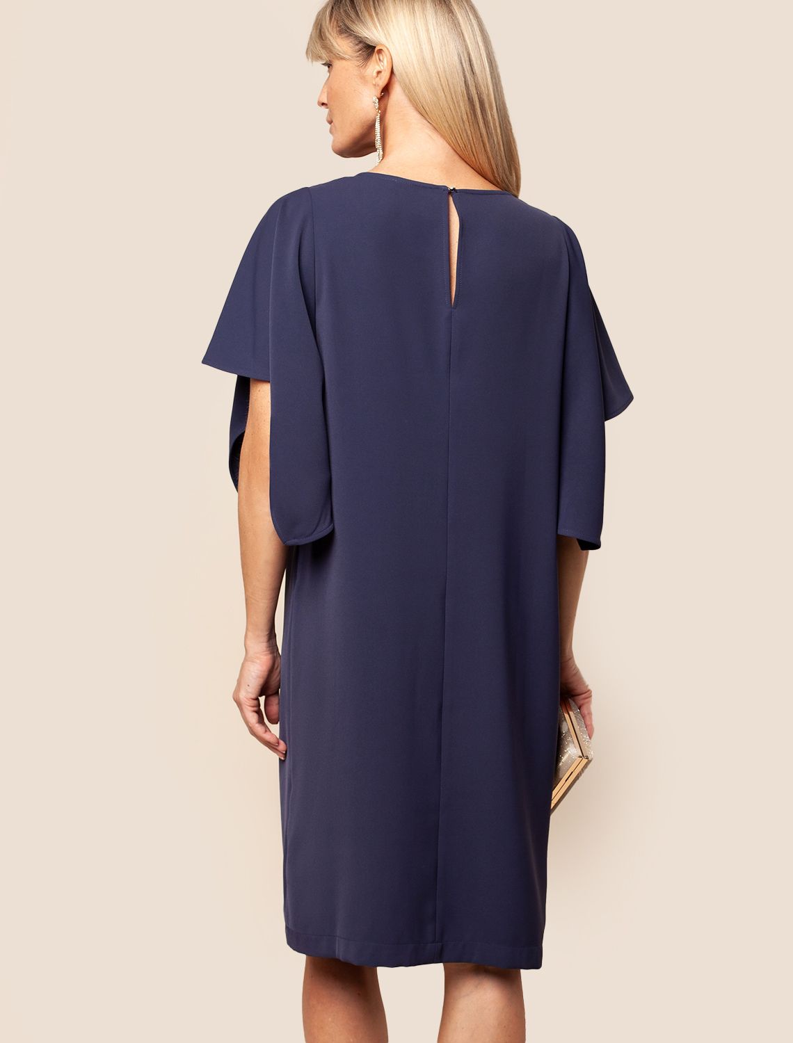 Платье из плотного струящегося крепа прямого кроя с «парящими» рукавами. Фасон платья сбалансирует любой тип фигуры: прямой свободный крой, универсальная длина подола – чуть ниже колена, широкая пройма и акцентные рукава. Классический О-образный вырез фиксируется сзади изящной золотой пуговицей. Материал почти не мнется и комфортен в носке.