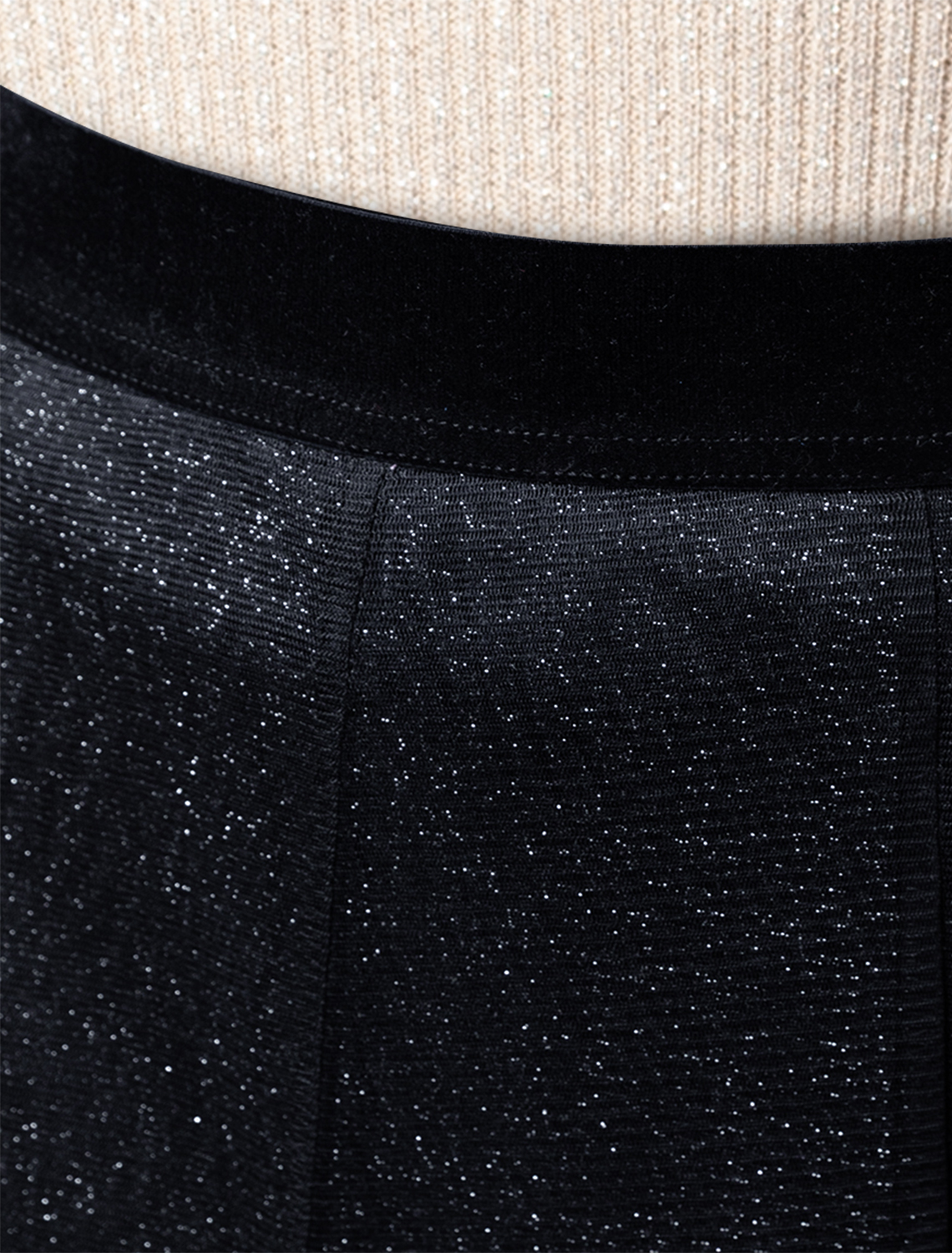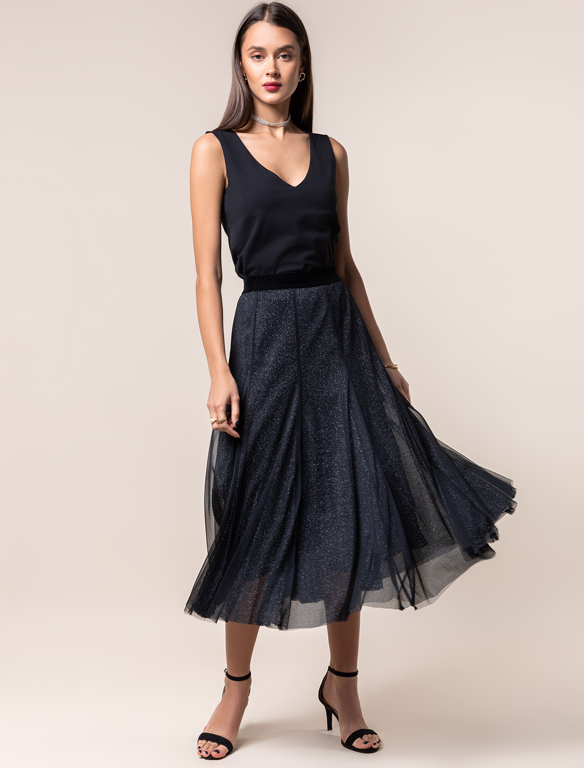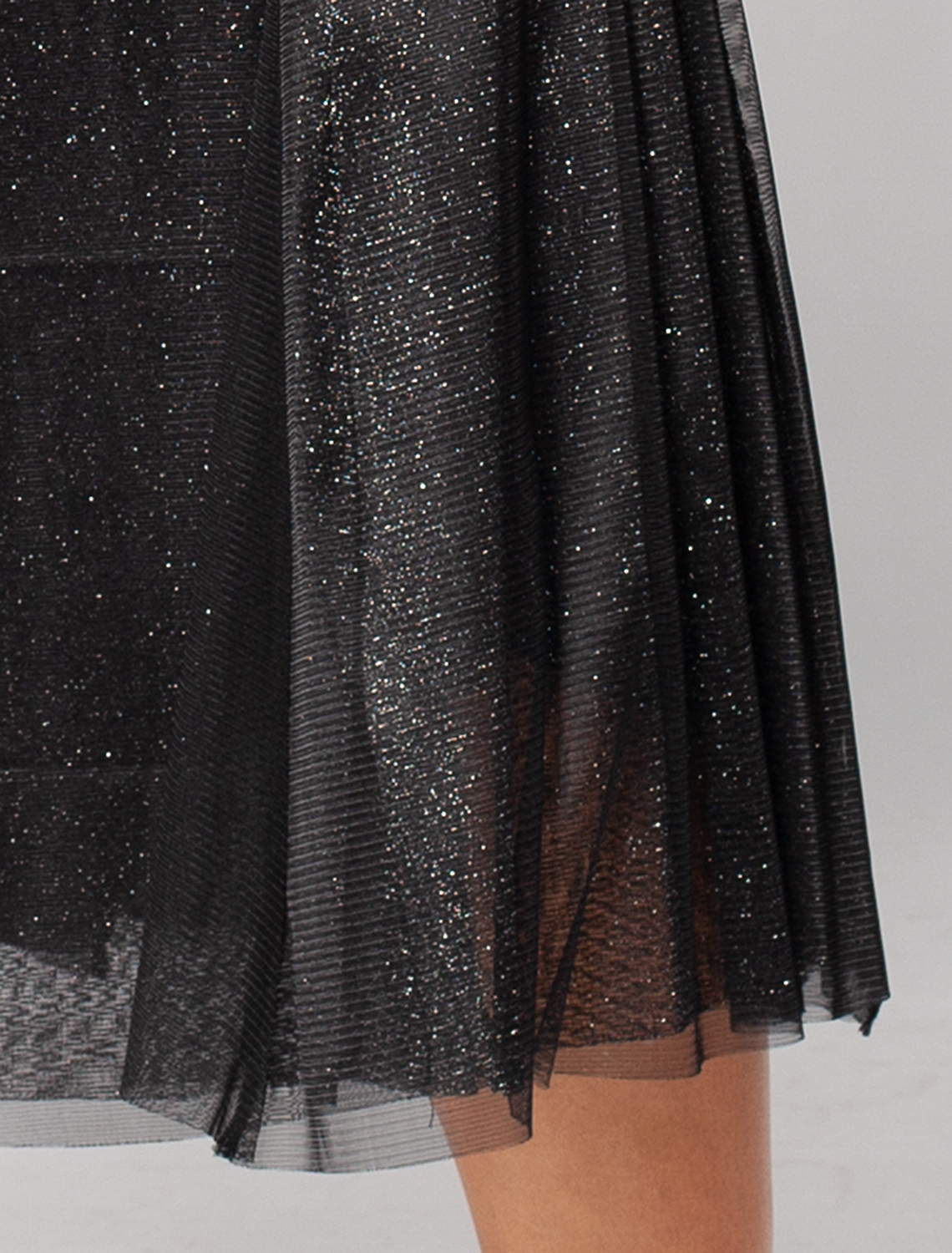 Роскошная юбка выполнена из сетки с люрексом и поясом из эластичной бархатной ленты. Пышный эффект создают три тонких слоя, первый прозрачный, второй сияющий с люрексом и третий подкладка из 100% вискозы. При каждом движении трехслойный этап создает впечатление россыпи алмазной крошки. Эта воздушная модель, поможет создать запоминающиеся праздничные образы, даже с базовым верхом.