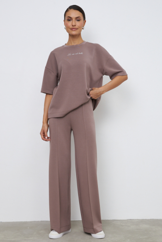 Брюки прямого силуэта из эластичного полотна. Пояс с эластичной резиной. На передней части брюк застрочены стрелки.