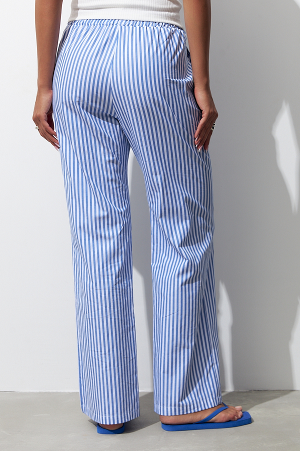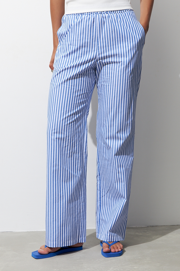 Брюки прямого силуэта из хлопковой ткани. Пояс притачной с эластичной резиной, в боковых швах карманы.