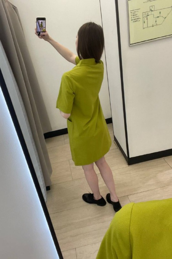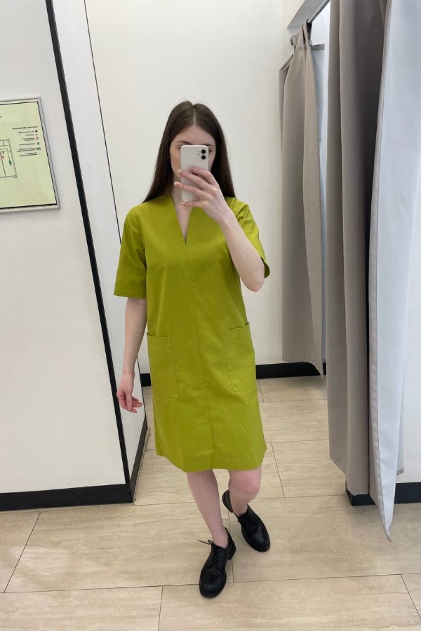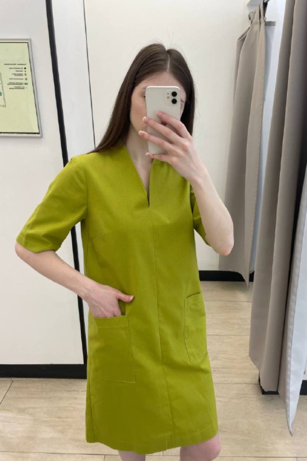 Платье свободного силуэта из льняной ткани. Короткий втачной рукав. По центру передней части изделия выполнен шов. Цельнокроеная стойка, переходящая в V-образный вырез горловины, визуально делает фигуру стройнее. Платье украшено накладными карманами.