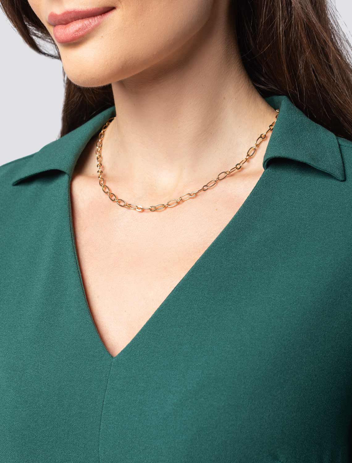 Платье приталенного силуэта и воротником-поло. Выполнено из эластичного крепа. Универсальная модель и трендовый крой в стиле 70-х годов, выгодная инвестиция для повседневного образа, деловой встречи или вечернего выхода. Можно носить с поясом, чтобы дополнительно подчеркнуть талию и А-силуэт.