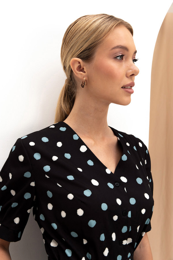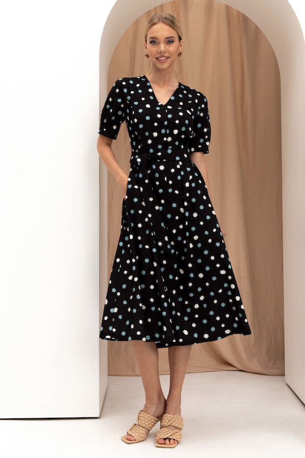 Платье из вискозной плательной ткани полуприлегающее в области груди и свободное в области бедер. Изделие отрезное по линии талии с застёжкой на пуговицы. В боковых швах карманы. V-образный вырез горловины, визуально делает фигуру стройнее. Втачной короткий рукав с защипами по низу рукава и манжетой. В комплекте пояс из основной ткани.