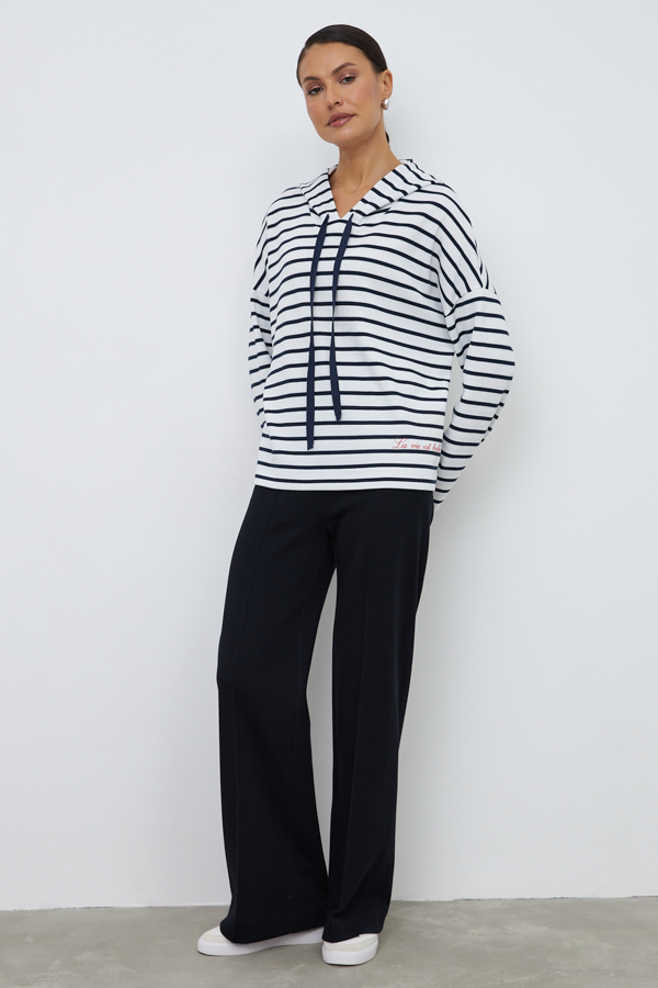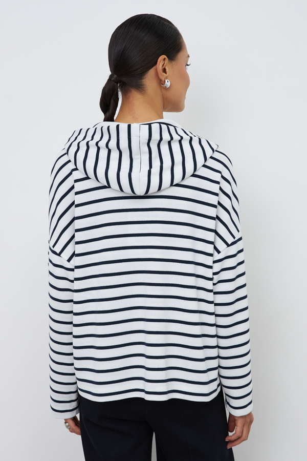 Худи с капюшоном из эластичного полотна. Изделие свободного силуэта со спущенной линией плеча и длинным рукавом. В таблице размеров представлены параметры человека, а не изделия.