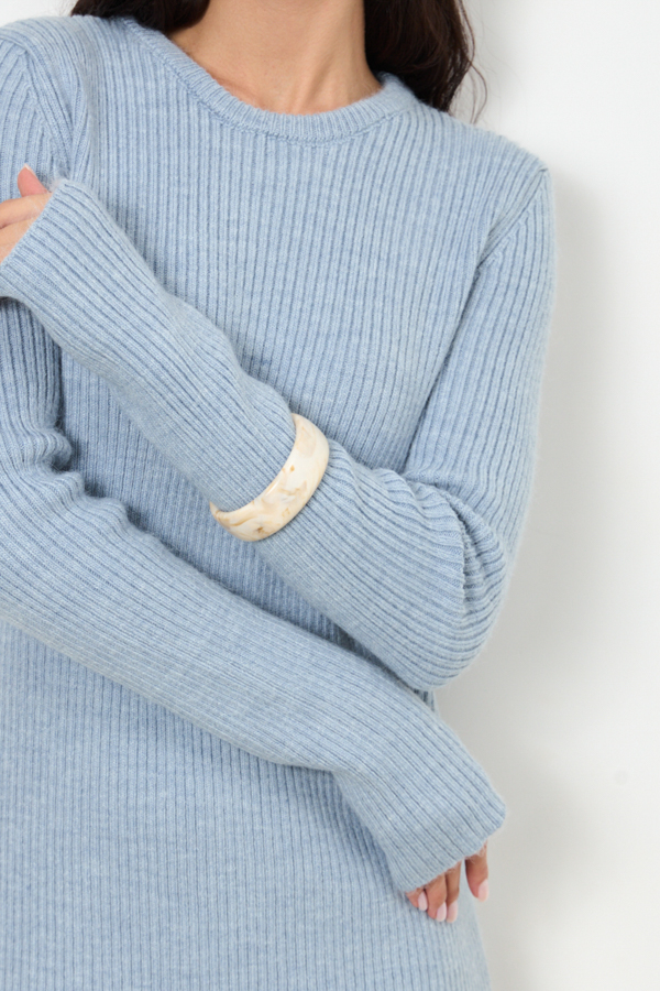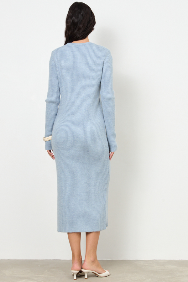 Платье прилегающего силуэта с рисунком в рубчик. Длинный втачной рукав. Круглый вырез горловины оформлен резинкой-бейкой. Изделие выполнено из мягкой меланжевой пряжи.