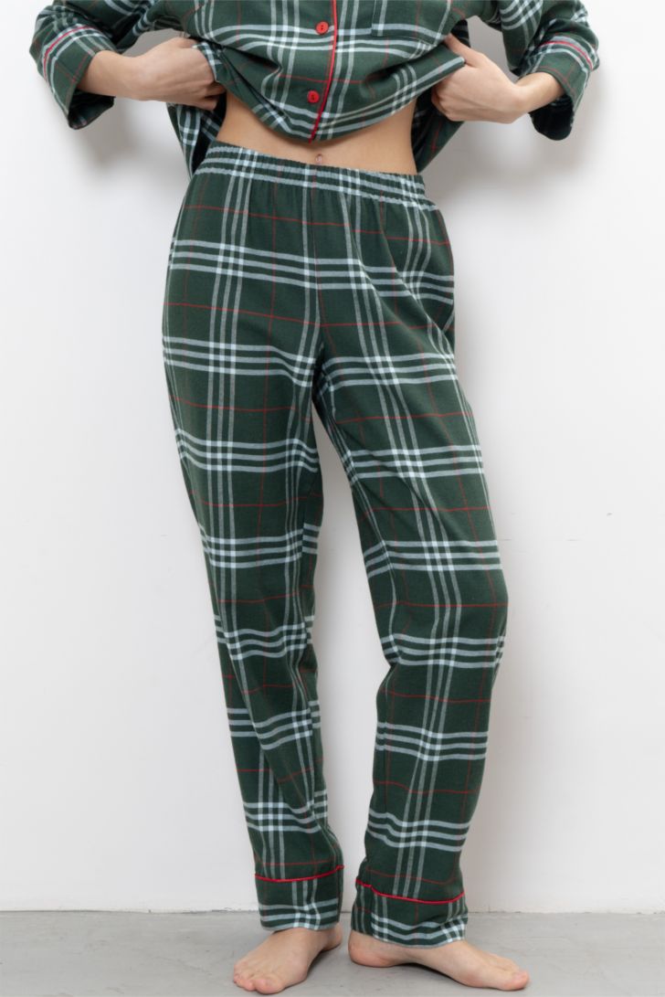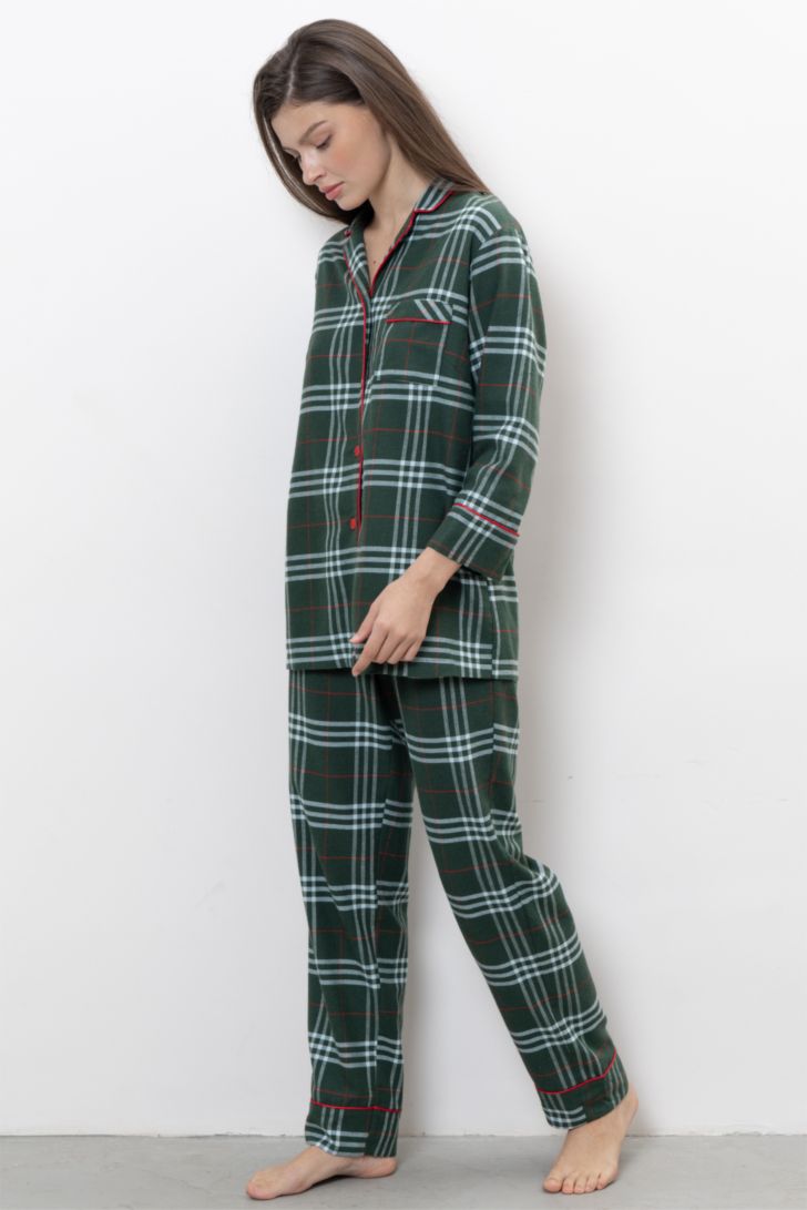 Пижама женская состоит из рубашки на пуговицах и брюк. У рубашки английский воротник, на груди карман. Пижама декорирована контрастными пуговицами и ярким кантом. Брюки прямые, свободного прилегания на резинке.