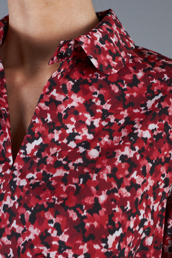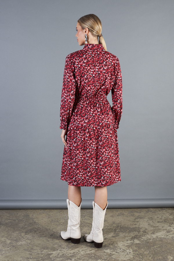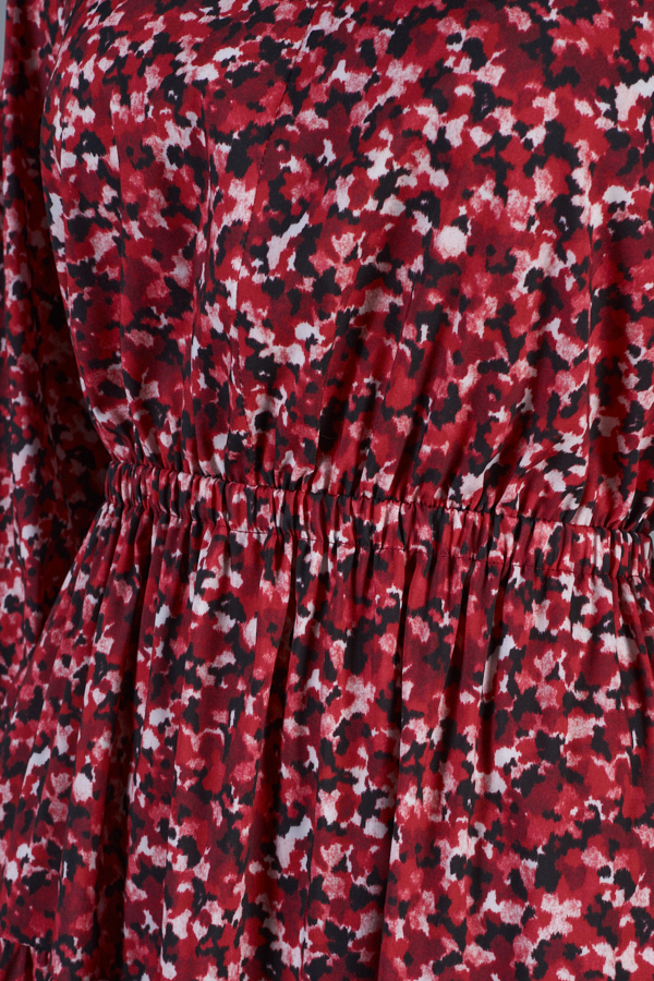 Платье свободного силуэта из плательной ткани. Изделие по линии талии на резинке, на юбке-сборка. V-образный вырез горловины обработан отложным воротником на стойке. Втачной длинный рукав с манжетой, застегивающейся на пуговицы.