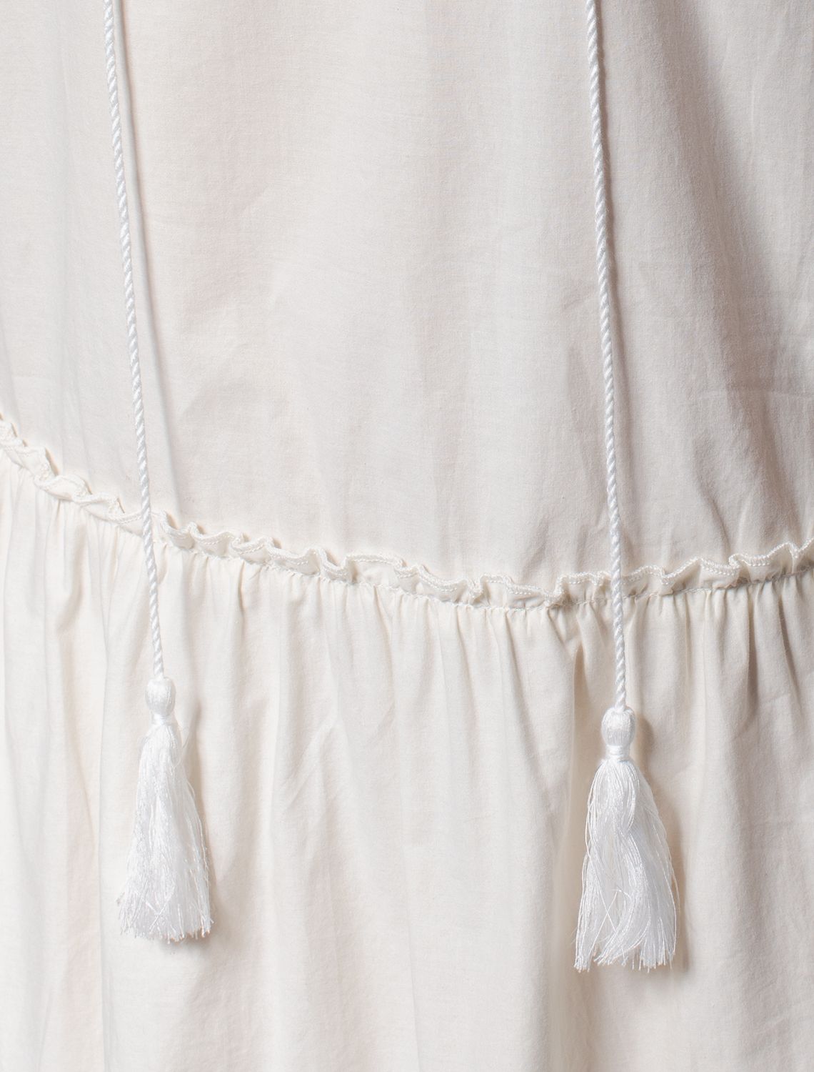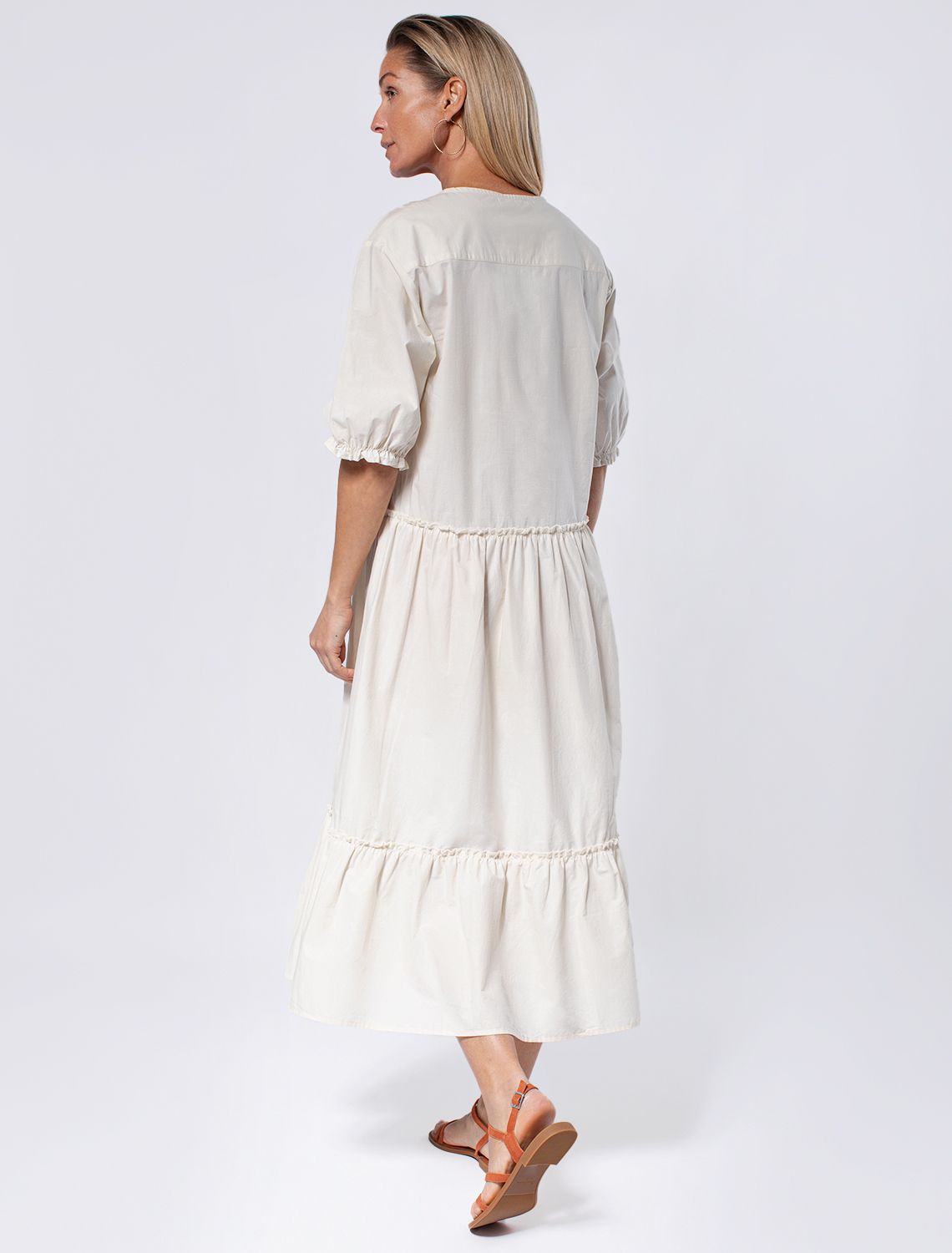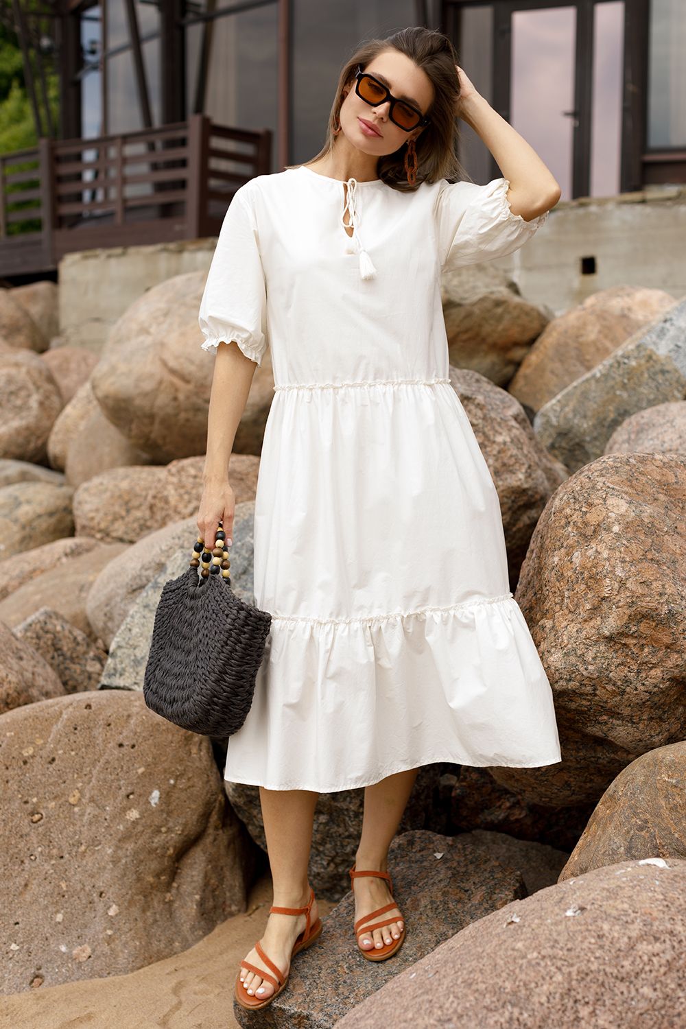 Платье с V-вырезом выполнено из легкого хлопкового поплина. Воздушная модель с пышной юбкой-воланами в стиле бохо отличный вариант для жаркой погоды. Натуральный состав ткани обладает высокой воздухопроницаемостью, а также способностью поглощать и отдавать влагу. В изделии будет очень комфортно, благодаря правильной регуляции температуры тела. Подходит для любой фигуры.