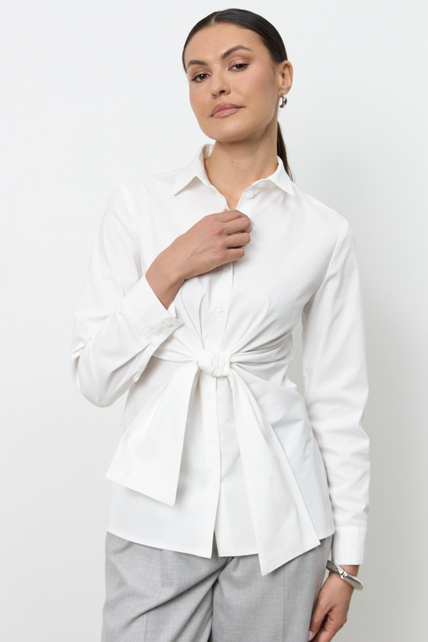 Рубашка из хлопковой ткани прилегающего силуэта с застёжкой на пуговицы. Оригинальный крой с завязками на передней части изделия. На задней части выполнены вытачки. Рубашечный рукав на манжете с застёжкой на пуговицы. Вырез горловины обработан отложным воротником на стойке.