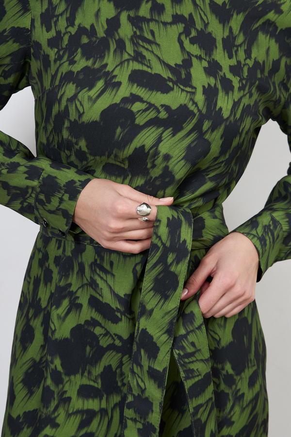 Платье из вискозной ткани полуприлегающего силуэта. Втачной длинный рукав на манжете с застёжкой на пуговицы. На задней части изделия застежка на петлю-пуговицу, снизу выполнен разрез. Круглый вырез горловины оформлен косой бейкой. В комплекте пояс из основной ткани.