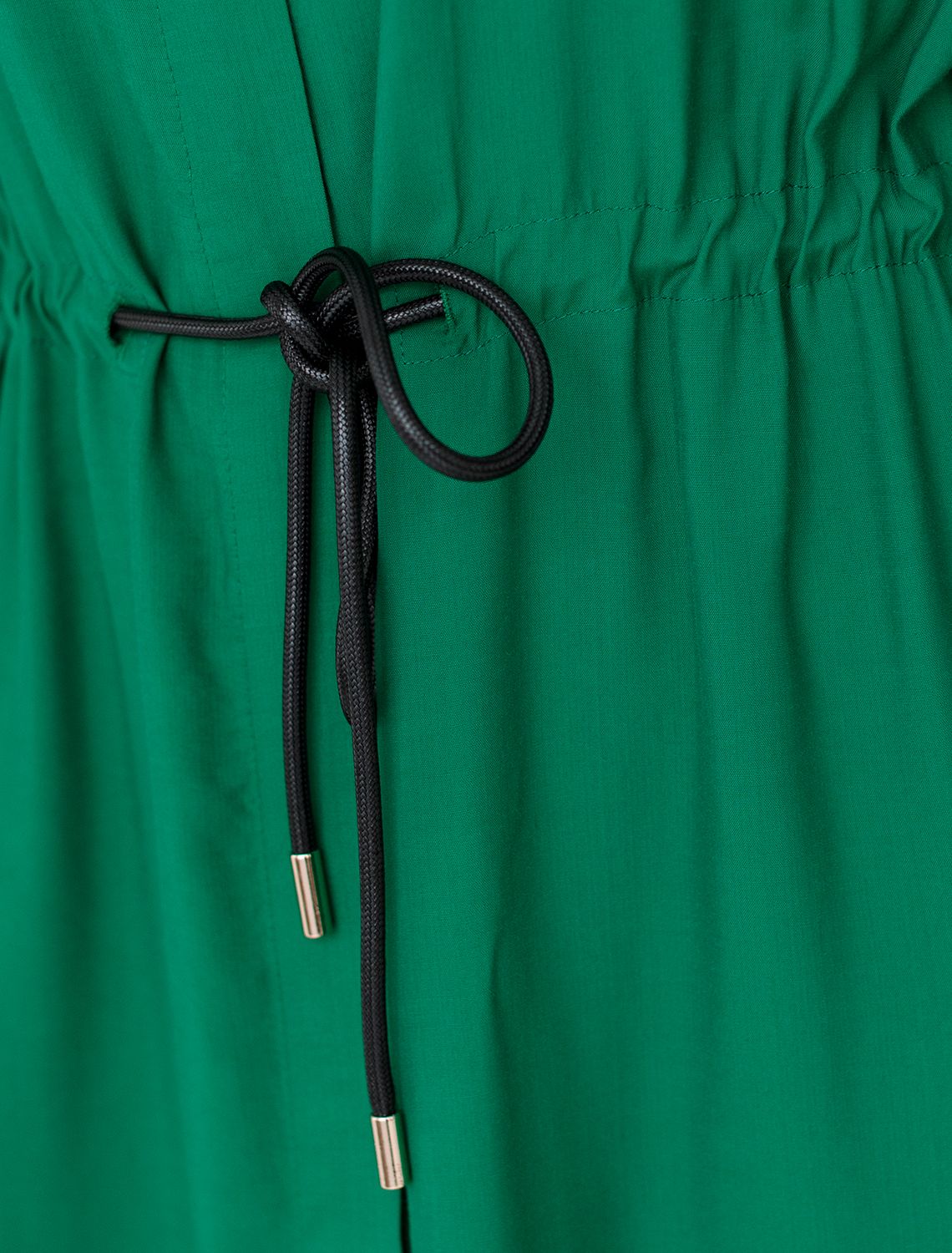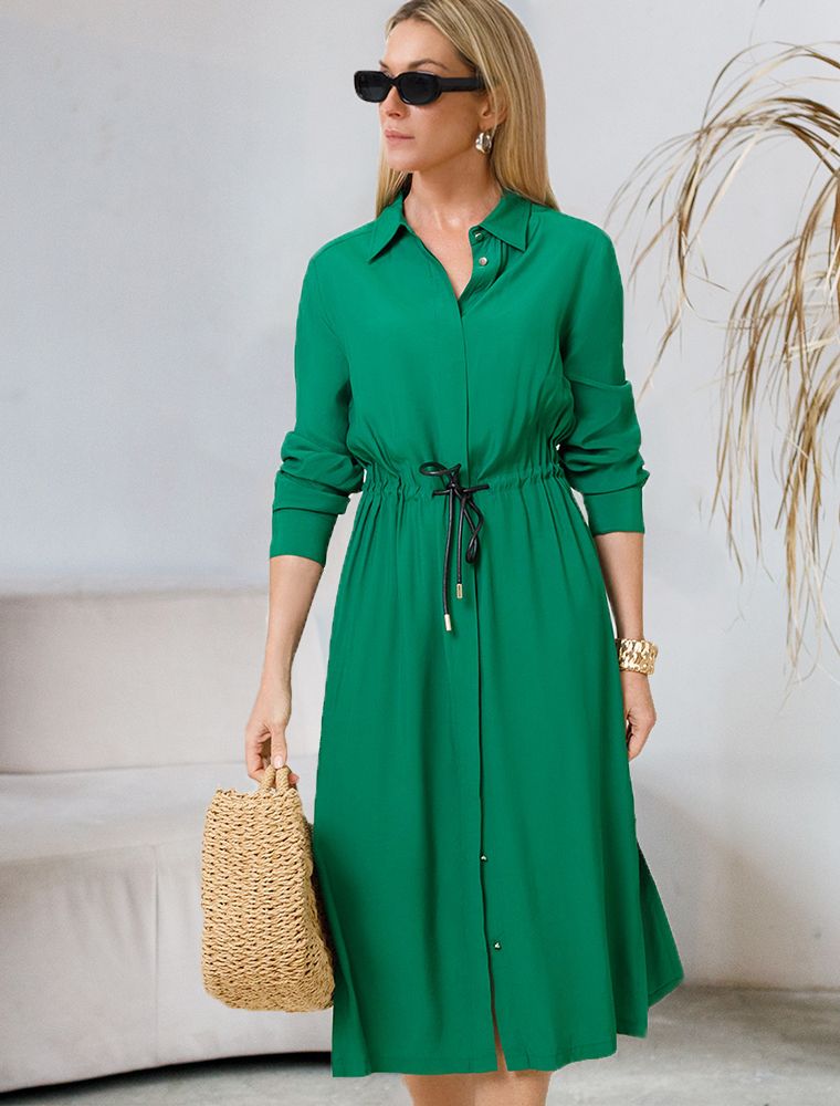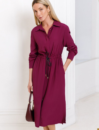 Платье А-силуэта с отложным воротником как у рубашки выполнено из лиоцелла с вискозой. Лаконичная модель с потайной застежкой на пуговицы дополнена боковыми карманами и поясом-шнуром из эко-кожи.Ткань поддерживает оптимальный микроклимат, поэтому изделие подходит для любого сезона.