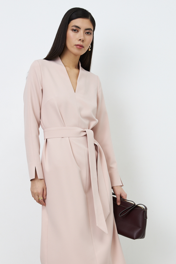 Платье свободного силуэта из плательной ткани. По центру передней части изделия выполнен шов. Цельнокроеная стойка, переходящая в V-образный вырез горловины, визуально делает фигуру стройнее. Втачной длинный рукав с центральным швом и декоративным разрезом по низу рукава. В комплекте пояс из основной ткани.