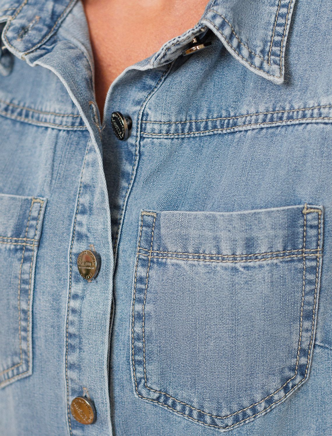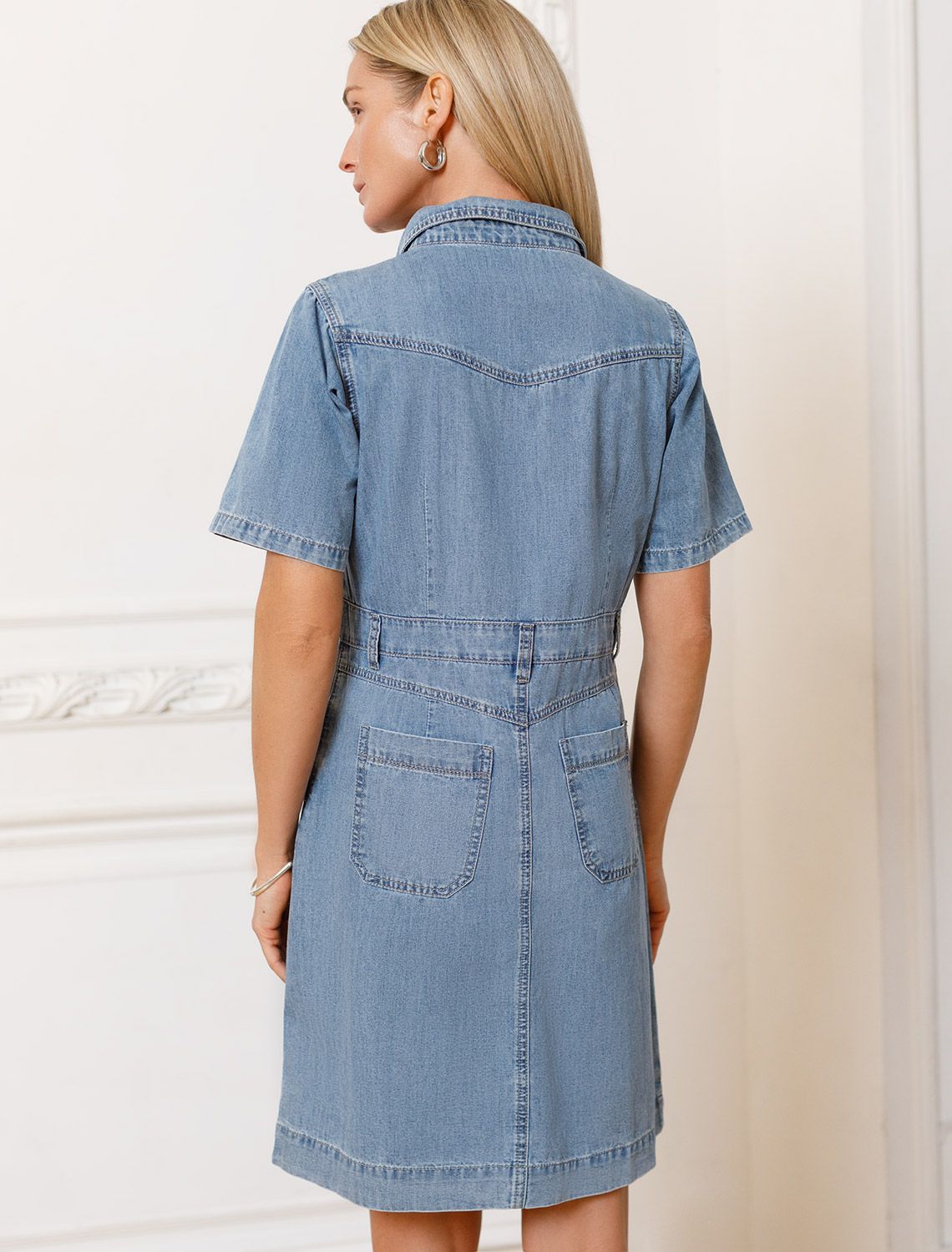 Платье выполнено из тонкого денима. Модель с пятью карманами как у джинс хорошо будет сочетаться как с открытой обувью, так и сапогами. Облегченный материал из 100% хлопка обеспечит комфорт даже в самый жаркий день. Изделие сидит по фигуре, не сковывая. Талию можно дополнительно подчеркнуть поясом.