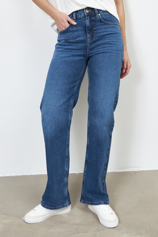 Брюки из эластичного денима выполнены по классической джинсовой технологии (варка с эффектом легкого выбеливания). Прямой классический крой. На задней части брюк выполнены накладные карманы, на передней - карманы с подкройным бочком. Притачной пояс со шлёвками. Застёжка на молнию-гульфик и пуговицу.