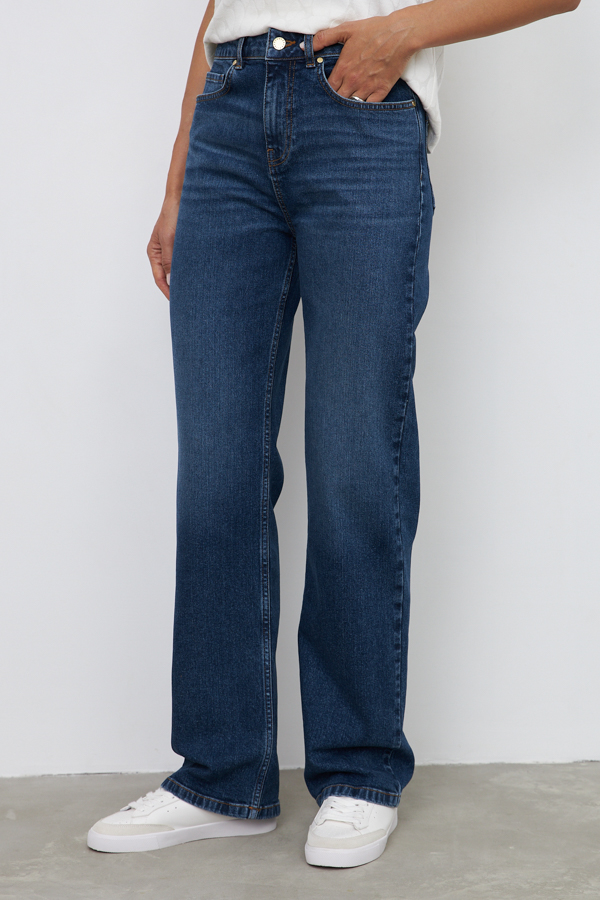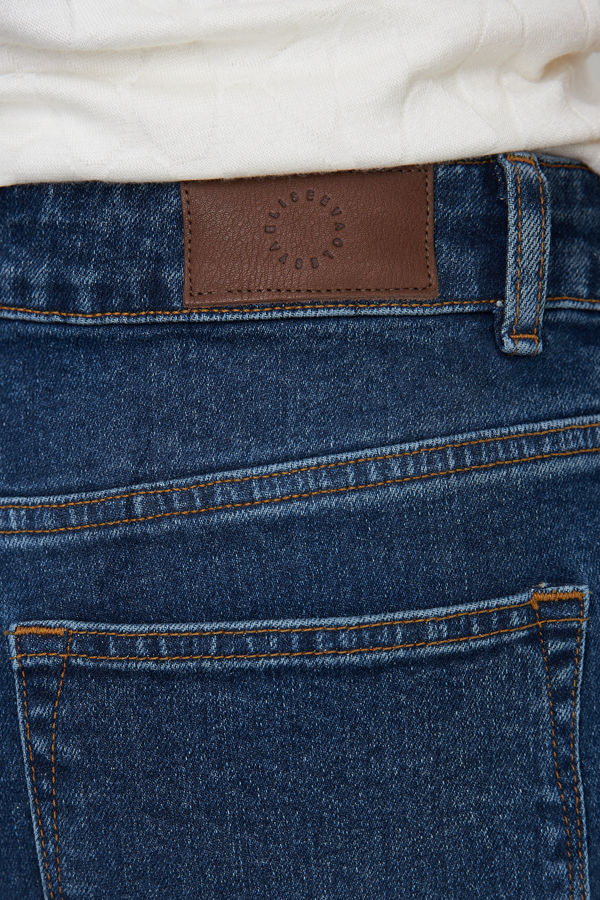 Брюки из эластичного денима выполнены по классической джинсовой технологии (варка с эффектом легкого выбеливания). Прямой классический крой. На задней части брюк выполнены накладные карманы, на передней - карманы с подкройным бочком. Притачной пояс со шлёвками. Застёжка на молнию-гульфик и пуговицу.